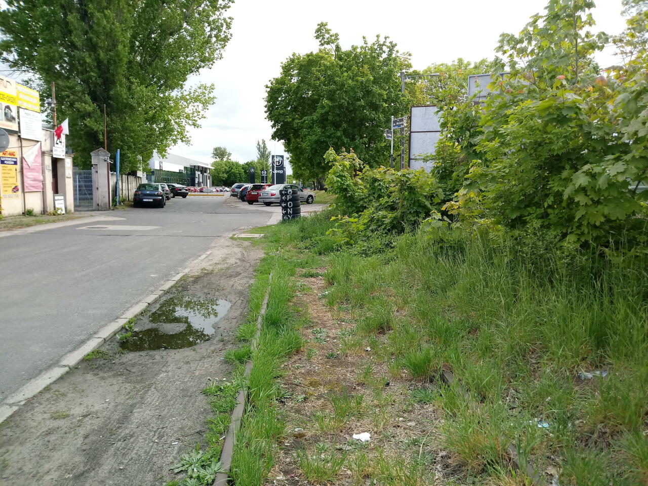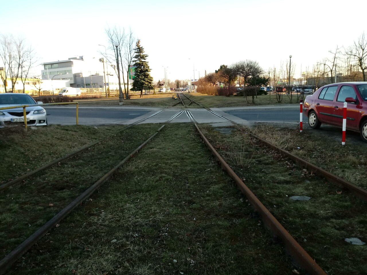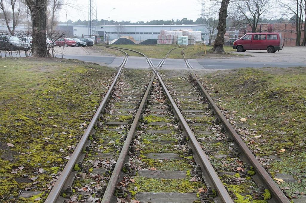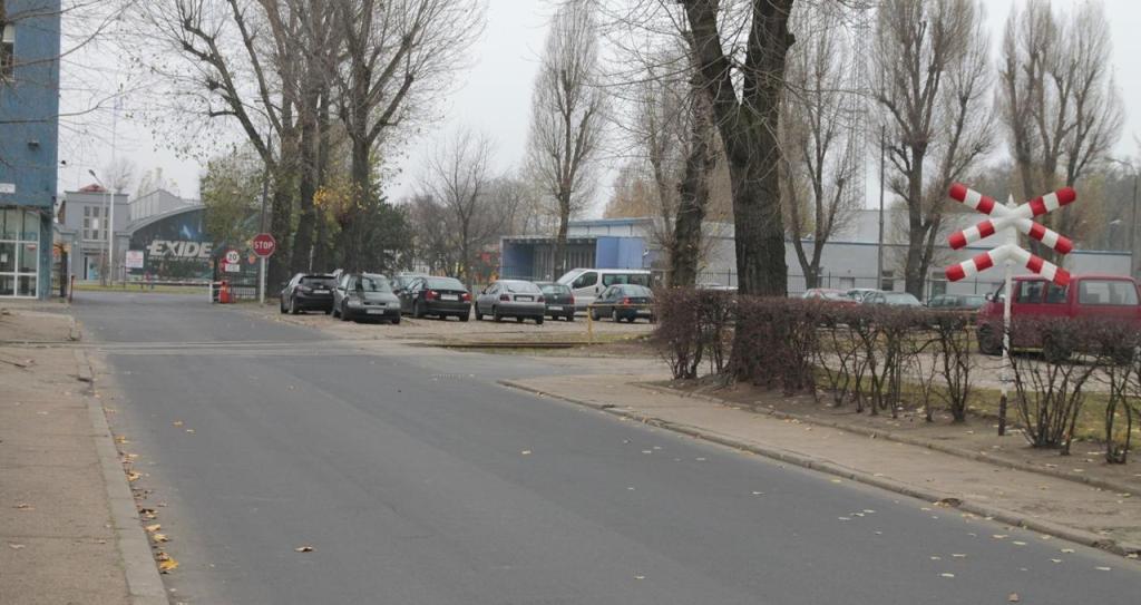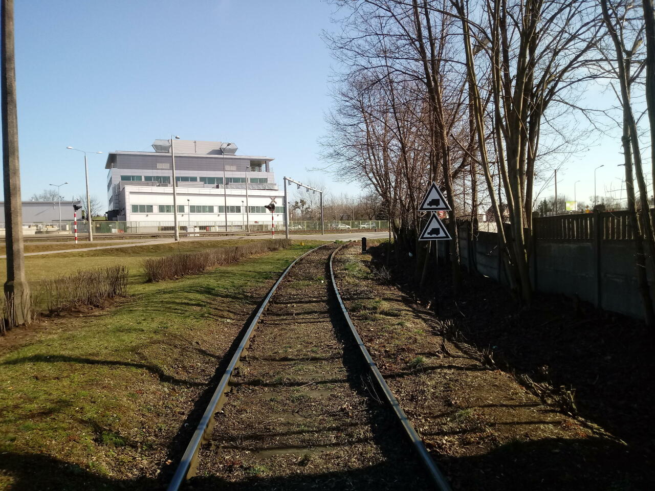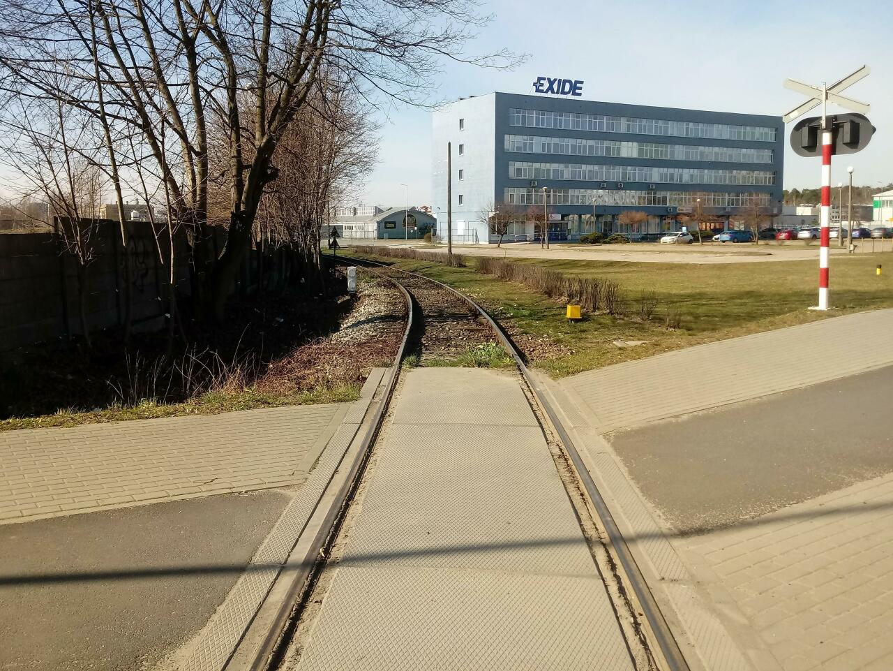 Widok w kierunku ul. Gdyńskiej (widoczna w oddali). Na lewo od tego toru znajduje się budynek z napisem EXIDE.