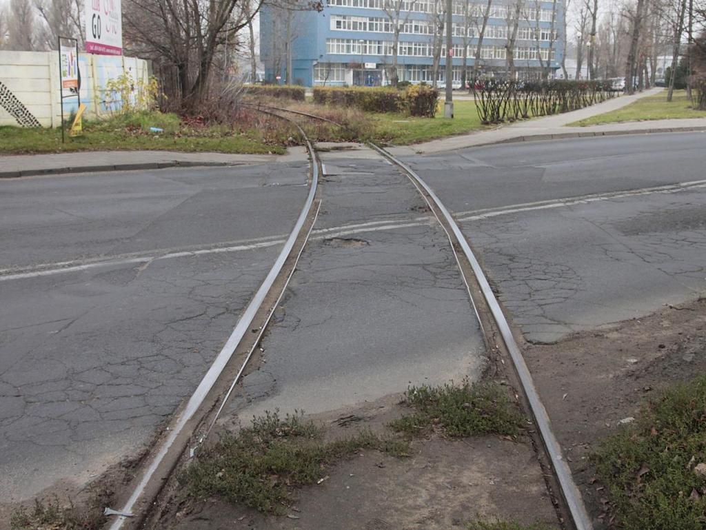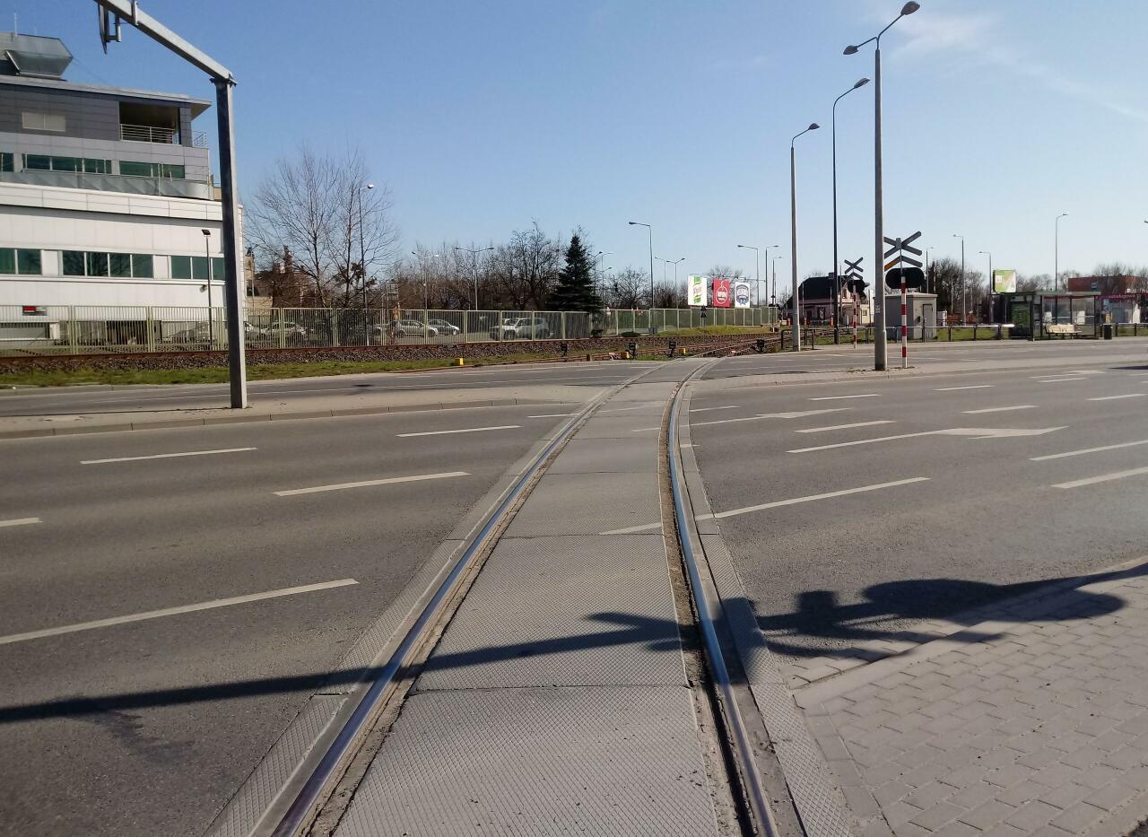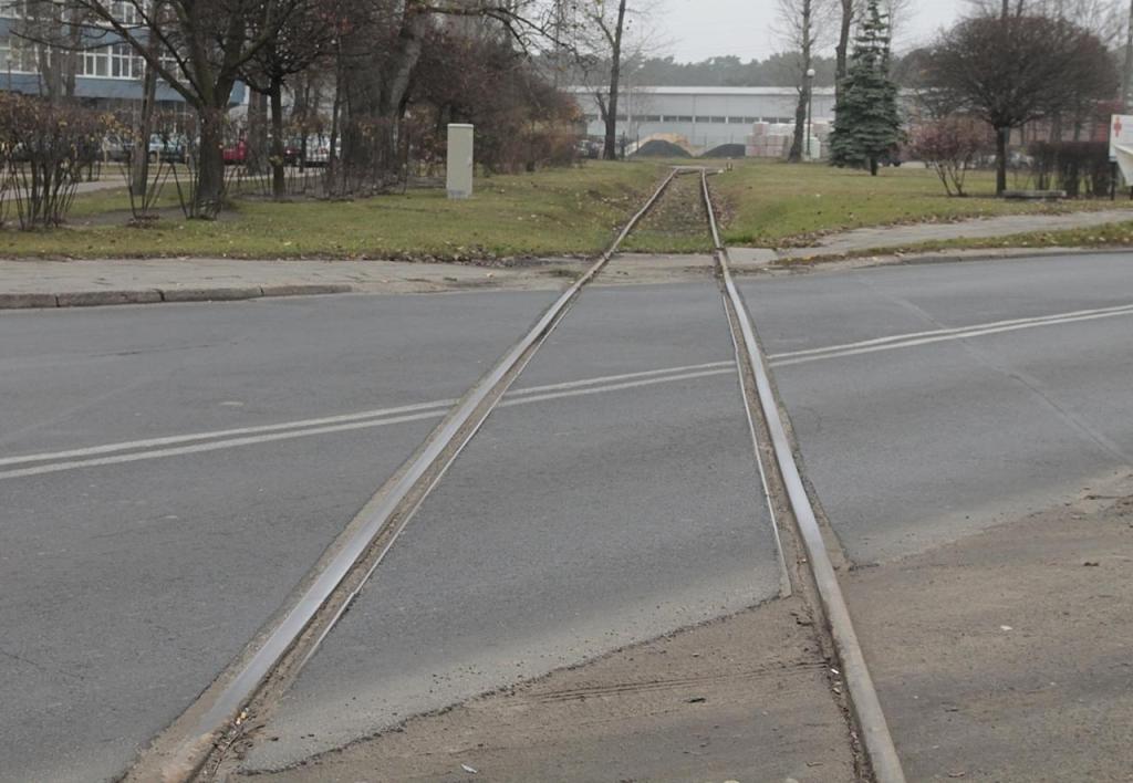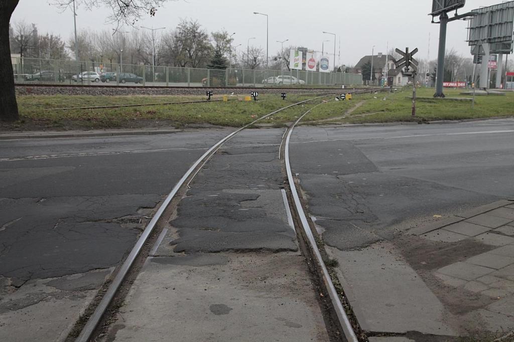 Tory przebiegające równolegle do ul. Średzkiej (po lewej). Po prawej, za krzakami, ul. św. Michała. Widoczne tabliczki z nazwami ulic.
