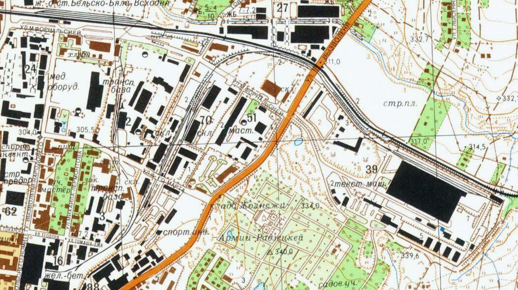 - Befa, Polsport, Społem i prawdopodobnie kilka innych - odgałęzienie od bocznicy Befamy, przecinało jednym torem ulicę Piekarską, później rozchodząc się do zakładów i małej dwustanowiskowej szopy na manewrówki.