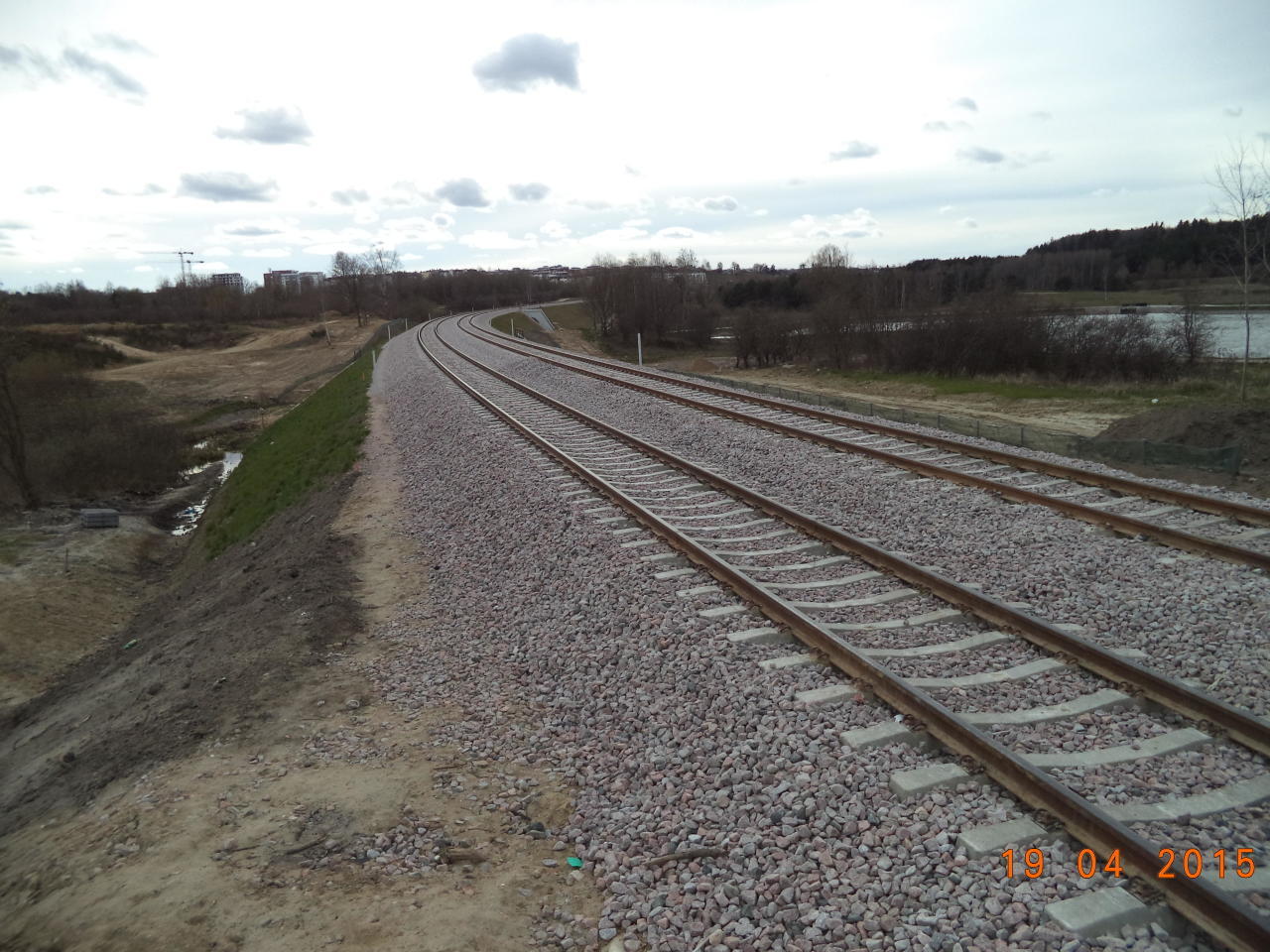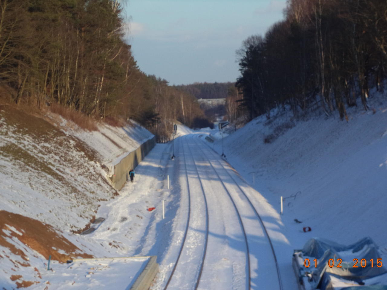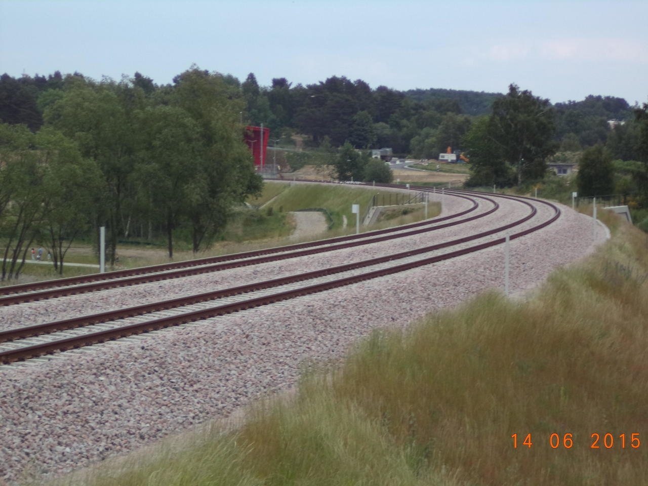 Widać, że slupy są już na całym odcinku, wraz z odgałęzieniem do Rębiechowa, a na części linii, nad 1 torem wisi już drut.