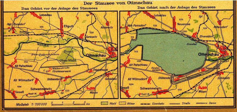 Są widoczne przyczółki mostu kolejowego z dwóch stron jeziora.