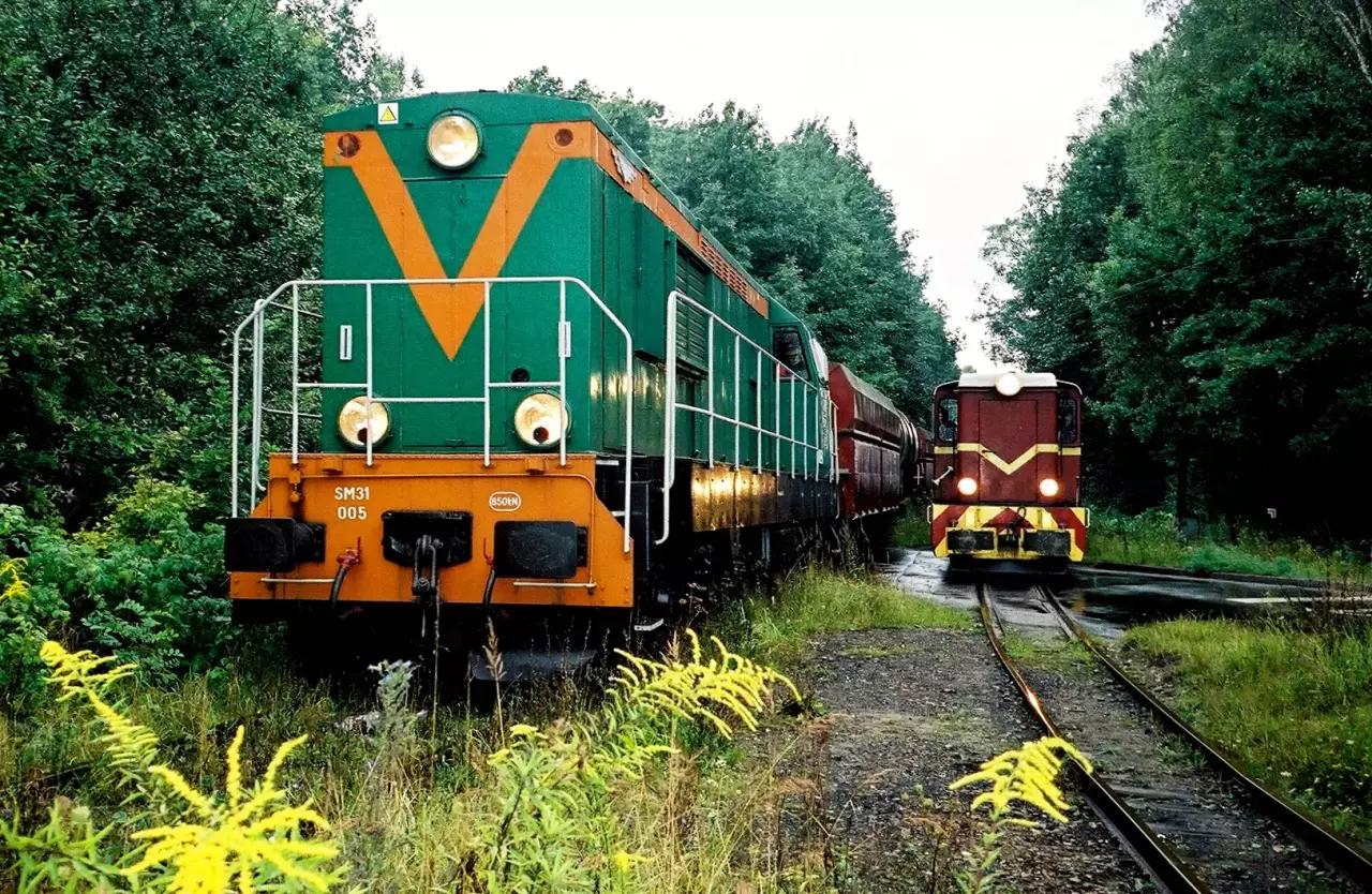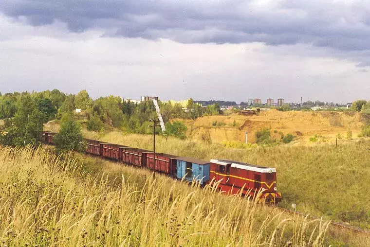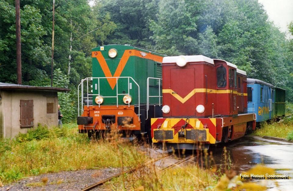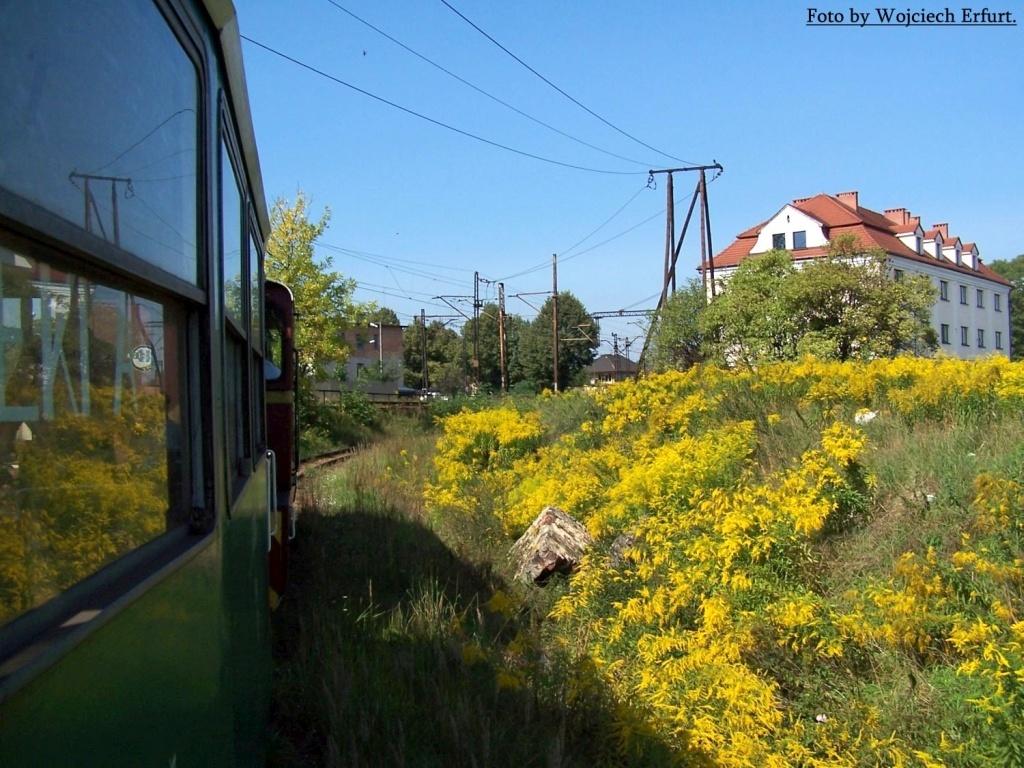 Co prawda linia wąskotorowa nadal istnieje, ale normalnotorowa od 13 lat już nie. Powstała 6 lat później niż szlak wąskotorowy, czyli w 1859 i była pierwszym połączeniem Tarnowskich Gór z okolicami Bytomia, konkretnie dzisiejszą dzielnicą Karb. Stąd biegła dalej, do Rudy Śląskiej - Chebzia. Zlikwidowana w 20-leciu międzywojennym, częściowo odbudowana po wojnie w celu obsługi kamieniołomu dolomitu w Bobrownikach oraz przelewni paliw w Suchej Górze (linia odgałęziała się od linii nr 131 mniej więcej w miejscu gdzie obecnie przecina ją autostrada A1 - tuż przy p.o. Bytom Północny). W 2003 roku po zamknięciu rozkradziona przez złomiarzy. Na zdjęciu wąskotorowa Lxd2-359 z wagonem typu opolskiego, tzw. Bytomką, oraz wagonem salonowym z 1912 roku Na torze normalnym SM31-005 z pociągiem z przelewni paliw w składzie którego były: wagon typu Talbot jako wagon osłonowy, cysterna i ponownie wagon typu Talbot również jako osłonowy. Zdjęcie wykonano 8.09.2001 roku na ulicy Dąbrowa Miejska w Bytomiu.