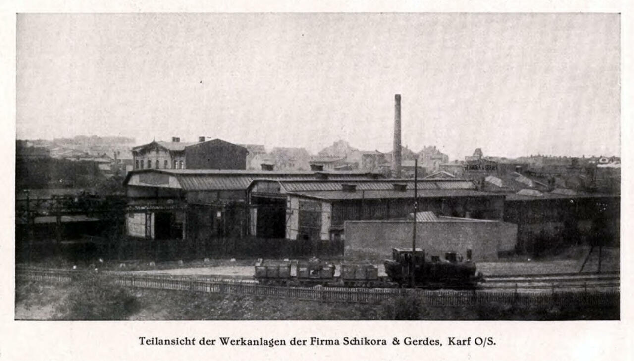Na pierwszym planie parowóz z składem kieruje się na Bytom Północny a w tle "Widok zakładu Schikora & Gerdes/Karf - Teilansicht der Werkanlagen der Firma Schikora & Gerdes".