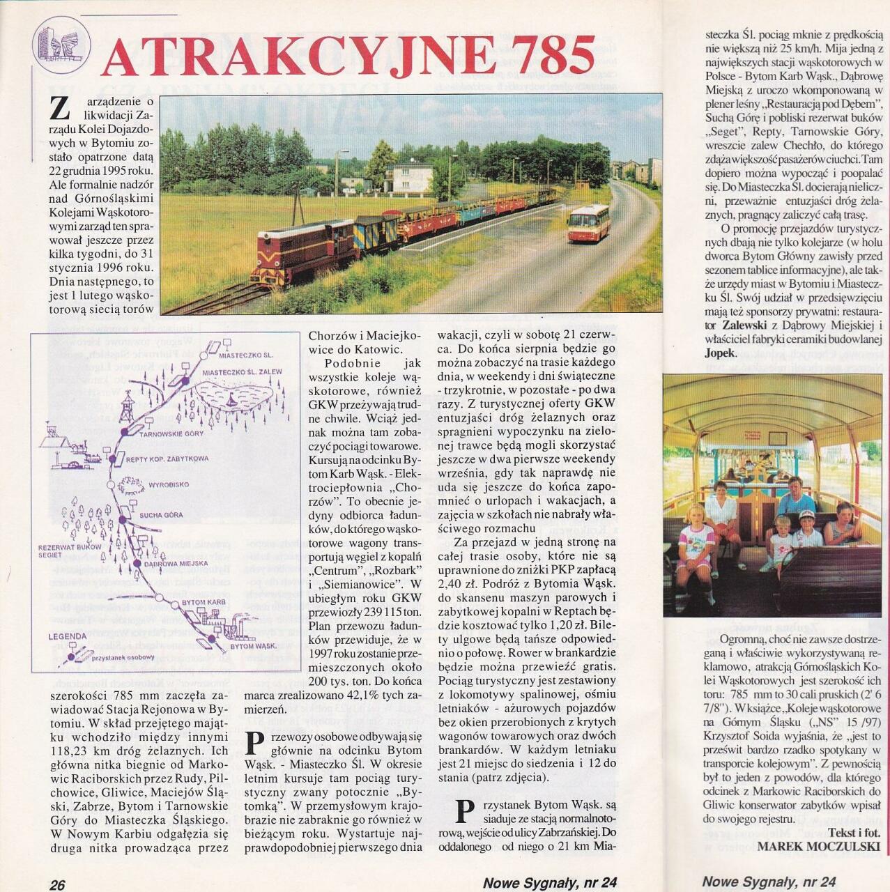 Skan artykułu z Nowych Sygnałów nr 24/97 o Górnośląskich Kolejach Wąskotorowych i ruchu turystycznym na nich.