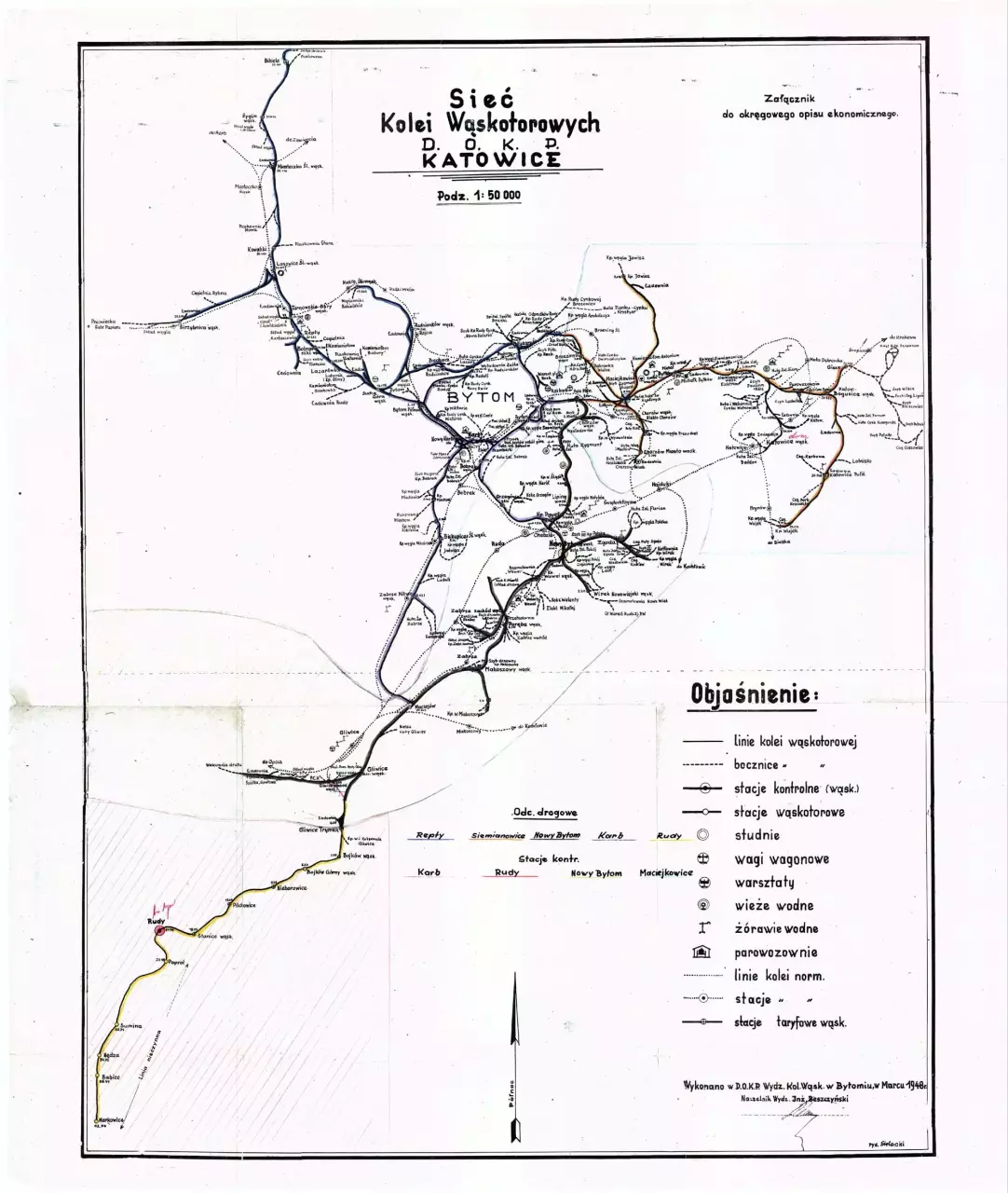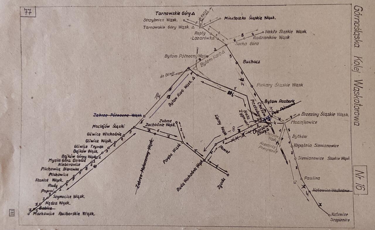 Schemat sieci Górnośląskich Kolei Wąskotorowych, wykreślony przez pracowników Zarządu Kolei Dojazdowych z siedzibą w Bytomiu - stanowił załącznik do Służbowego Rozkładu Jazdy Pociągów Górnośląskiej Kolei Wąskotorowej. Stan na dzień 1 kwietnia 1981 roku.