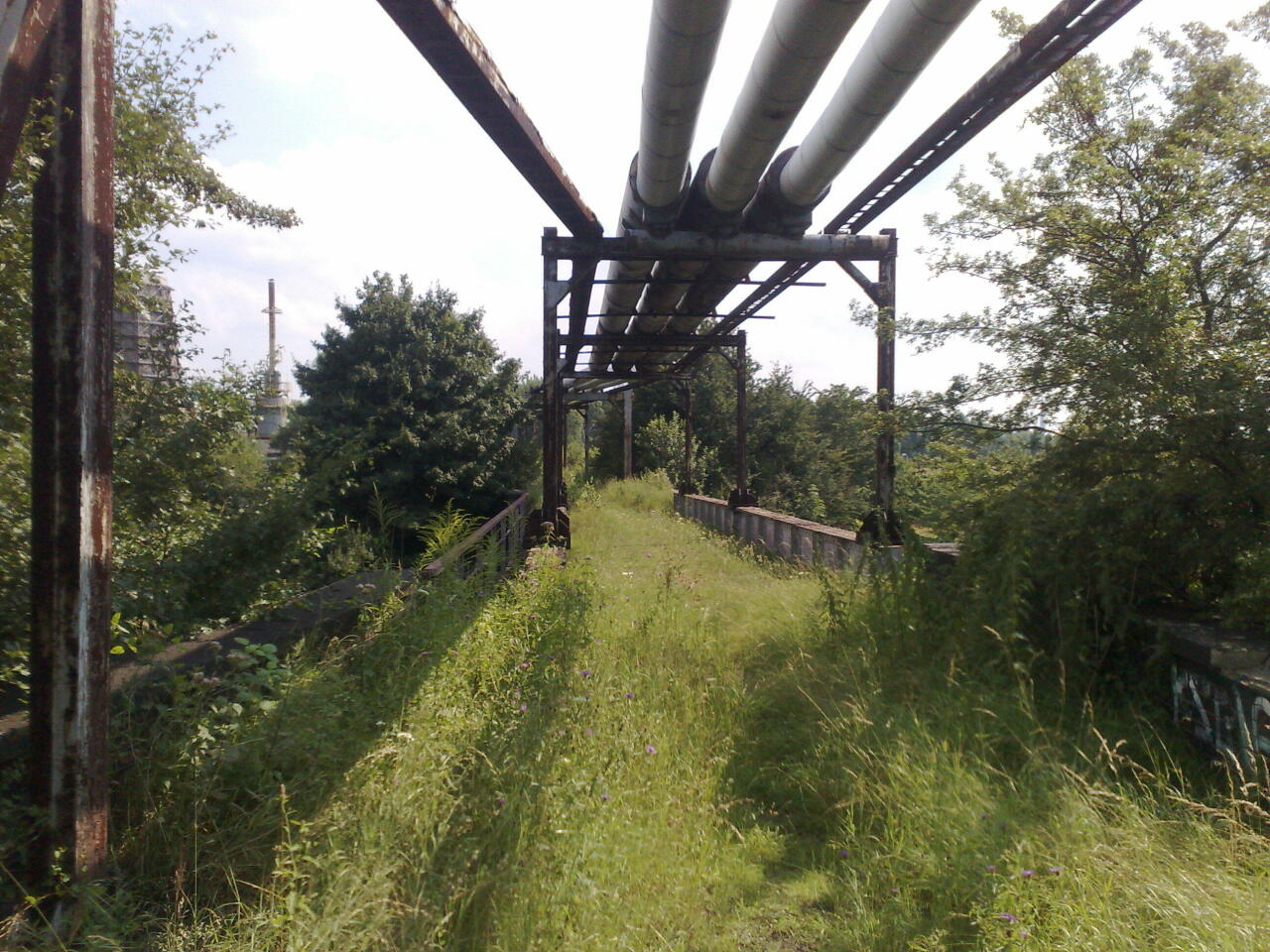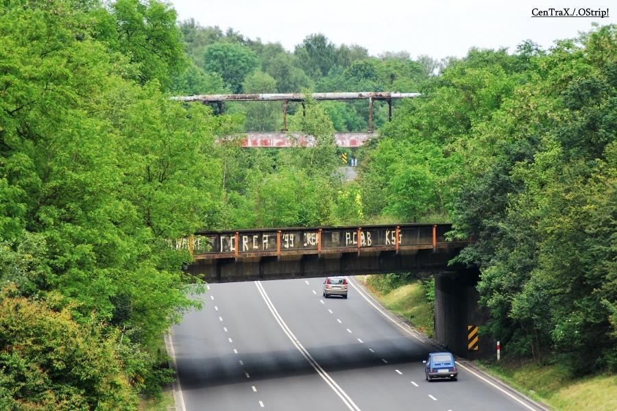 Przed wiaduktem. Tuż przed wiaduktem nad starą autostradą dołączają się jakieś rury łączące dawną kopalnię Pstrowski z koksownią Jadwiga.