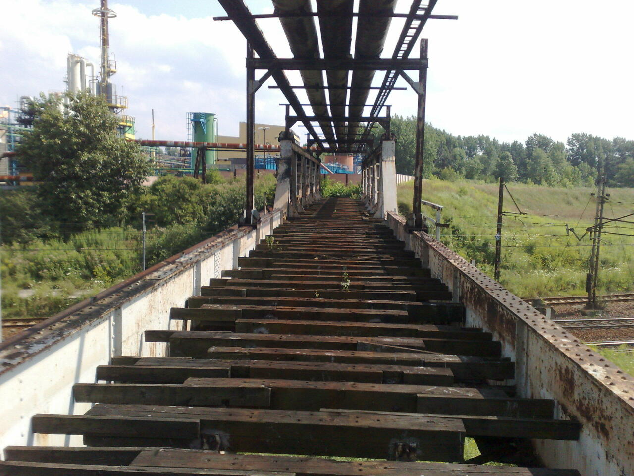 Nad torami. Po przejściu nad starą autostradą, linia przechodziła nad torami ze stacji Biskupice. Potem tor wąski skręcał łukiem w prawo. Dziś trudno to odtworzyć, bo, ja widać na zdjęciu, na szlaku stoi płot. Po wiadukcie na upartego można przejść, ale ja się bałem. Zostały same podkłady a pod nimi linie energetyczne. A ja nie lubię prądu…