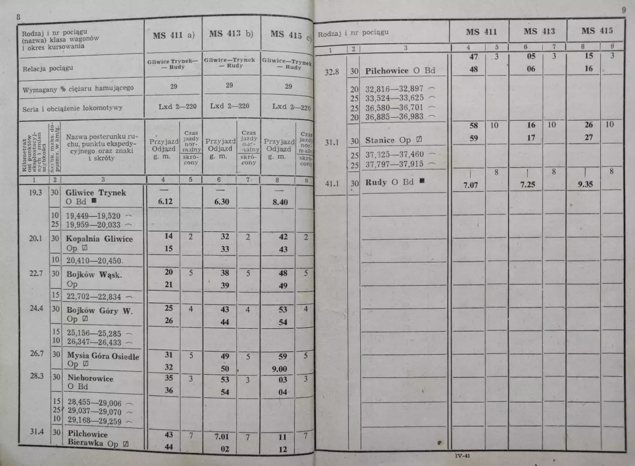 Pociągi pasażerskie na odcinku Gliwice Trynek - Rudy, skan ze Służbowego Rozkładu Jazdy Pociągów Pasażerskich i Towarowych - zeszyt IV-41, strony 8-9 (RJ 1985/1986).