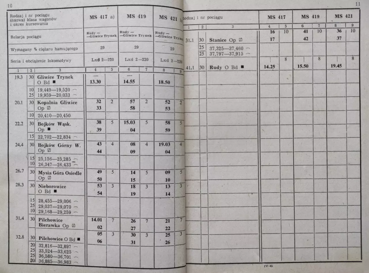 Pociągi pasażerskie na odcinku Gliwice Trynek - Rudy, skan ze Służbowego Rozkładu Jazdy Pociągów Pasażerskich i Towarowych - zeszyt IV-41, strony 10-11 (RJ 1985/1986).