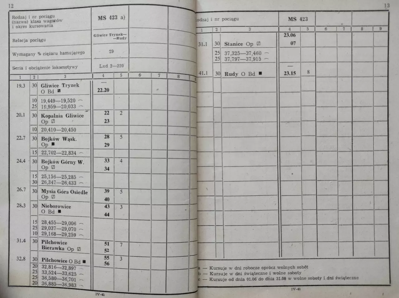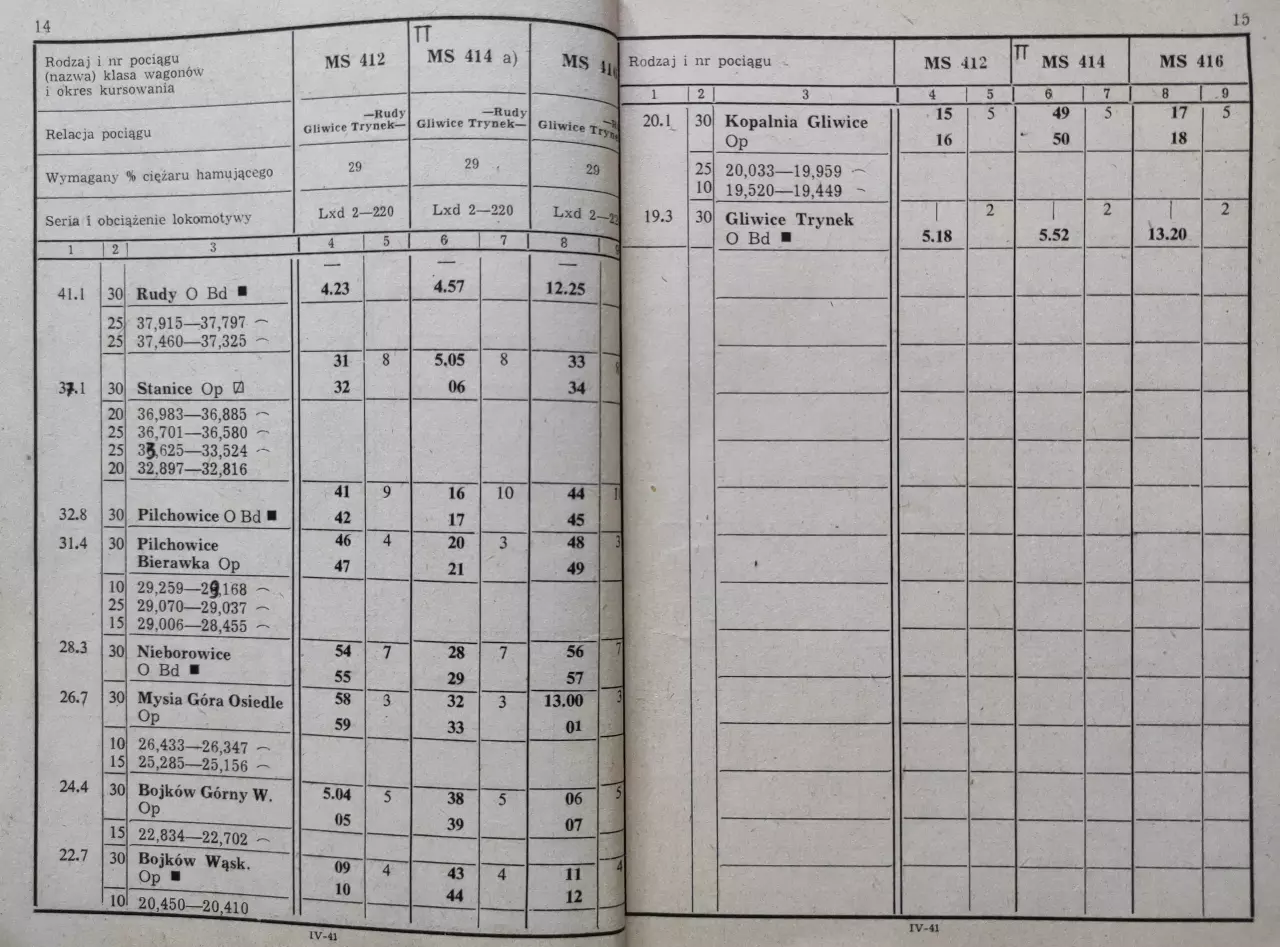 Pociąg pasażerski na odcinku Gliwice Trynek - Rudy, skan ze Służbowego Rozkładu Jazdy Pociągów Pasażerskich i Towarowych - zeszyt IV-41, strony 12-13 (RJ 1985/1986).