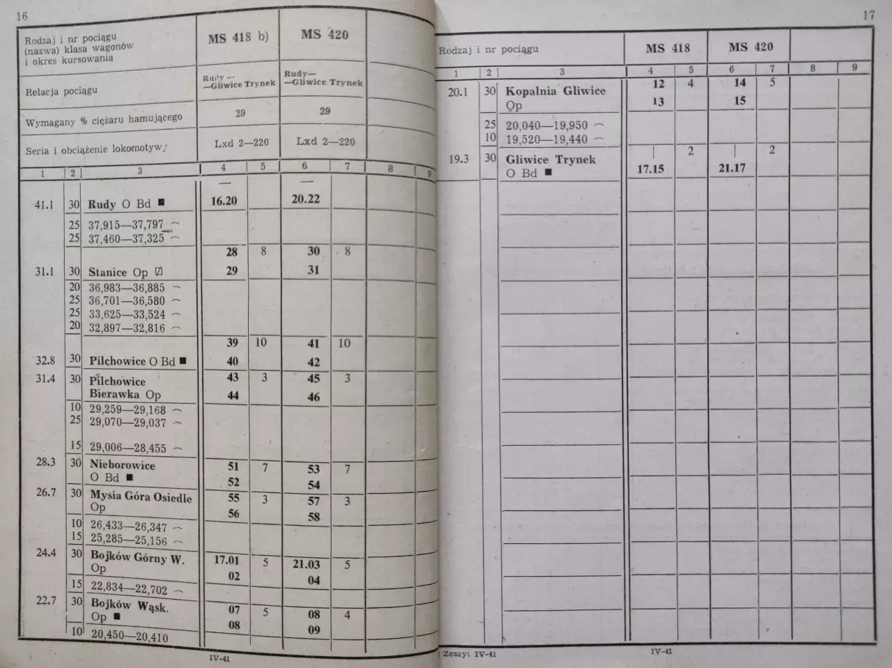 Pociągi pasażerskie na odcinku Rudy - Gliwice Trynek, skan ze Służbowego Rozkładu Jazdy Pociągów Pasażerskich i Towarowych - zeszyt IV-41, strony 16-17 (RJ 1985/1986).
