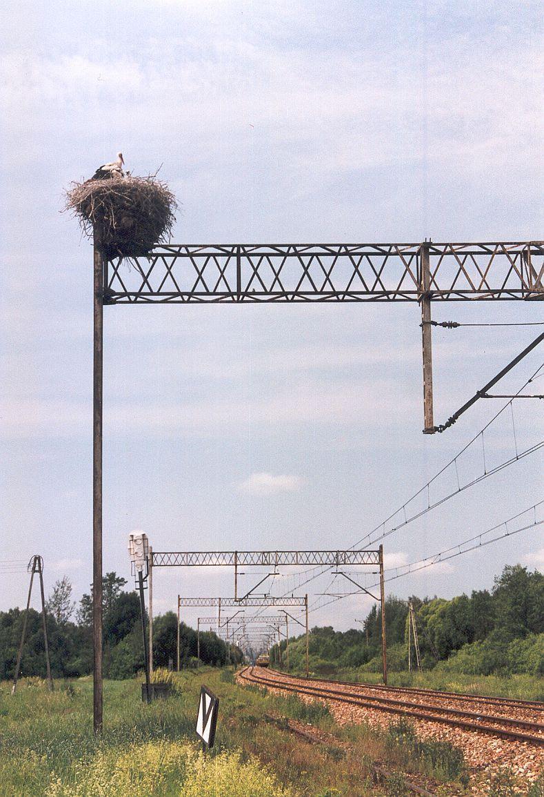 Bocianie gniazdo na bramce. Obecnie przeniesione na postawiony obok słup. Widok w kierunku Dorohuska.