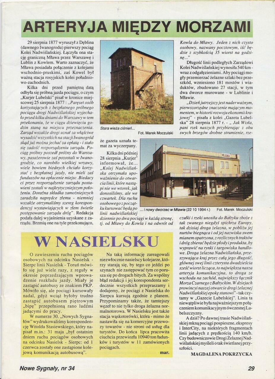 Skan artykułu z Nowych Sygnałów (34/97) o Kolei Nadwiślańskiej i zawieszeniu ruchu na odcinku Nasielsk - Sierpc.