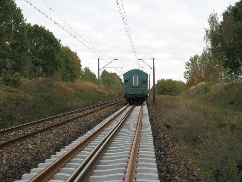 Pociąg technologiczny wymieniający nawierzchnię na torze nr 1 szlaku Sadurki - Motycz i efekt jego pracy.