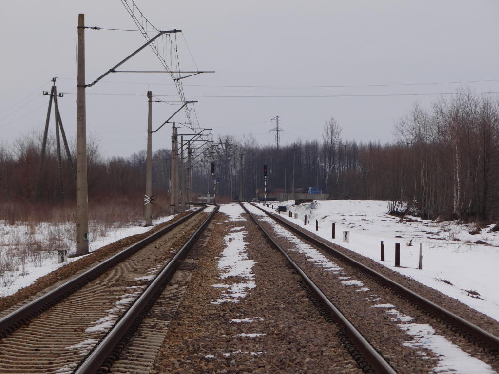 Po prawej linia szerokotorowa. W oddali semafory wjazdowe stacji Dorohusk od strony Chełma. Widok w kierunku Kowla. 267,9 km/3,6 km.