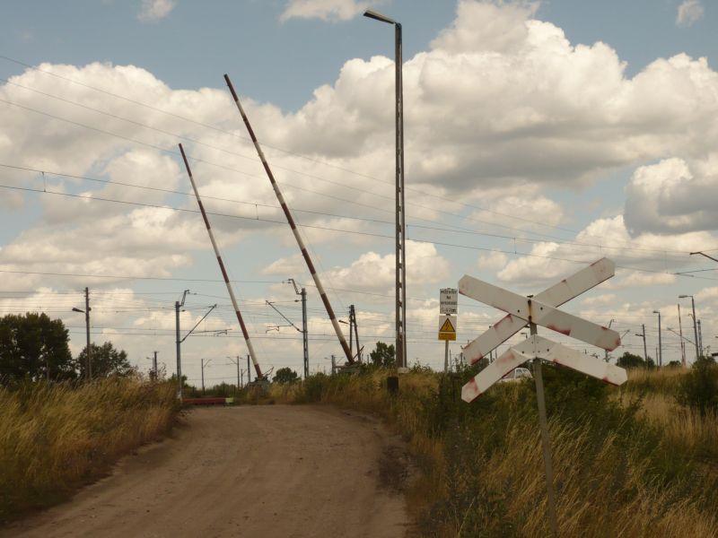 Przejazd przy linii S-Ł z wyblakniętym krzyżem św. Andrzeja.