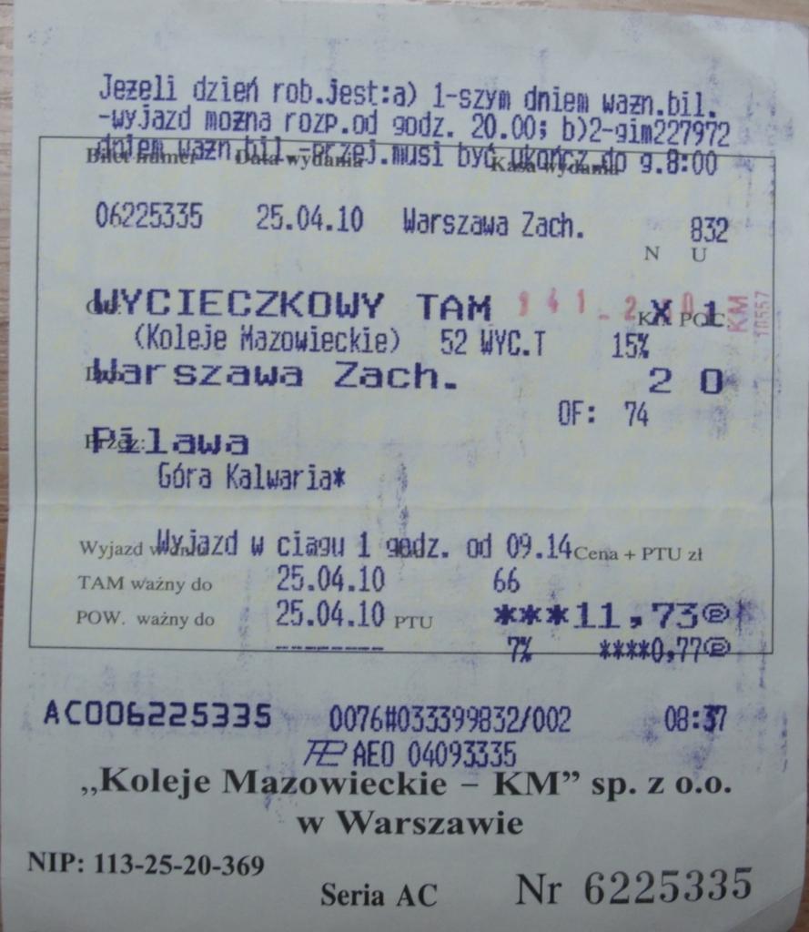 Bilet na pociąg Kolei Mazowieckich do Pilawy przez Górę Kalwarię, obecnie nie do zdobycia, pociągi osobowe dojeżdżają tylko do Góry Kalwarii.