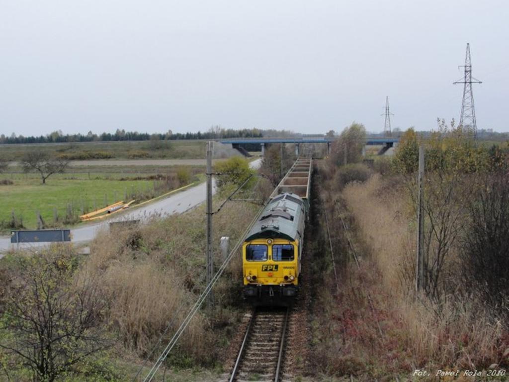 FPL, widok z wiaduktu z ulicą Rawską w kierunku Skierniewic, w oddali wiadukt, z E67. Lokomotywa Class 66 o nr 66005 ciągnąc węglarki podąża w stronę. Mszczonowa.
