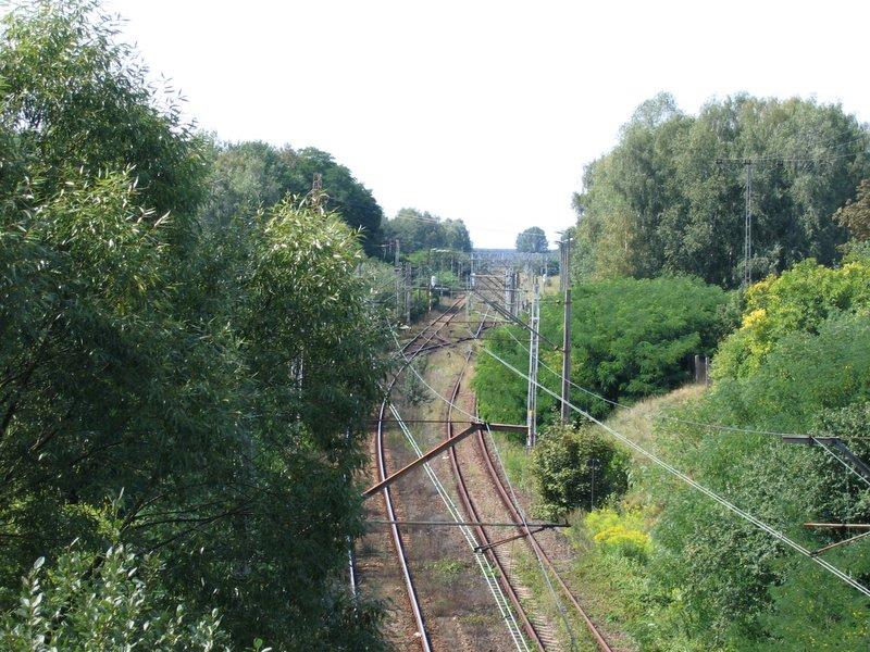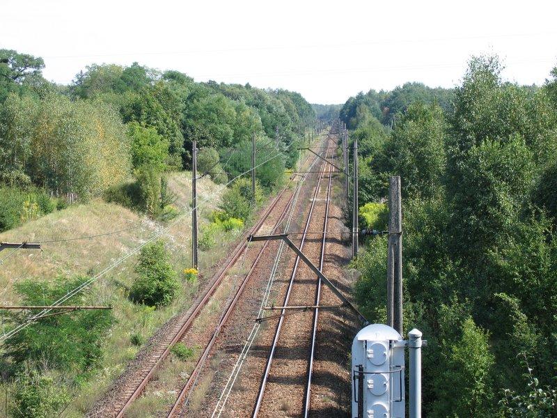 Widok w stronę Warszawy, w oddali wiadukt po którym biegnie linia Skierniewice-Łuków.