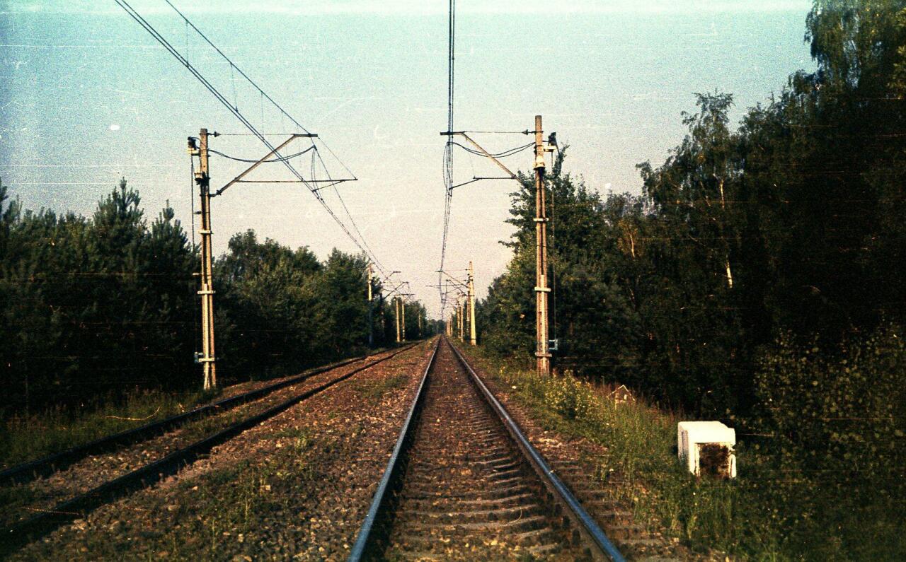 Zdjęcie zrobione z wiaduktu w okolicach stacji Puszcza Mariańska. Tor w kierunku Skierniewic wygląda na nieużywany.