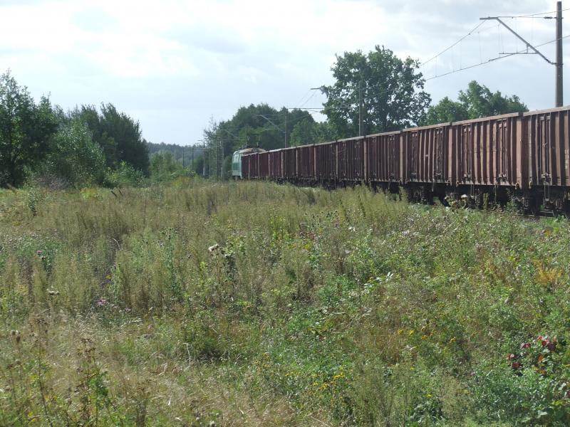 Pociąg towarowy prowadzony przez ET05 R012 zbliża się do Grzebowilka od str. Mińska.