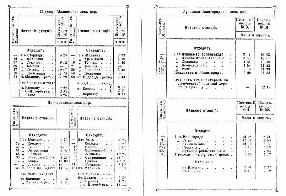 Rosyjskojęzyczny rozkład jazdy pociągów tras Siedlce - Małkinia - Ostrołęka - Łapy oraz Łuków - Krzywda - Dęblin (Iwangorod).