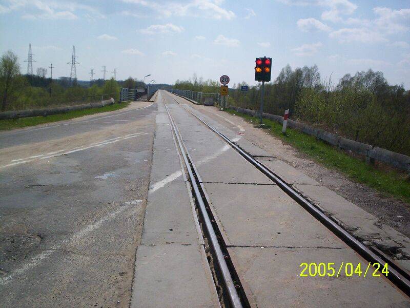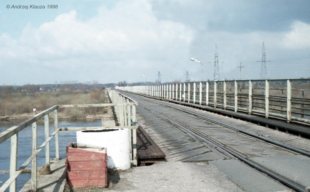 Most kolejowo-drogowy na Bugu, widok konstrukcji, most drewniany, ruch wahadłowy drogowy po jednym pasie ŁĄCZNIE z ruchem kolejowym (Tory na moście istnieją, jednak przed i za mostem - już nie.), dla pojazdów drogowych ograniczenia: skrajni i wysokości (bramki), masy i prędkości - ruch tylko lekkich samochodów osobowych, ruch pojazdów szynowych byłby niemożliwy;