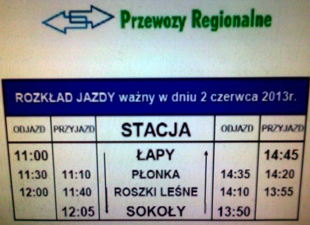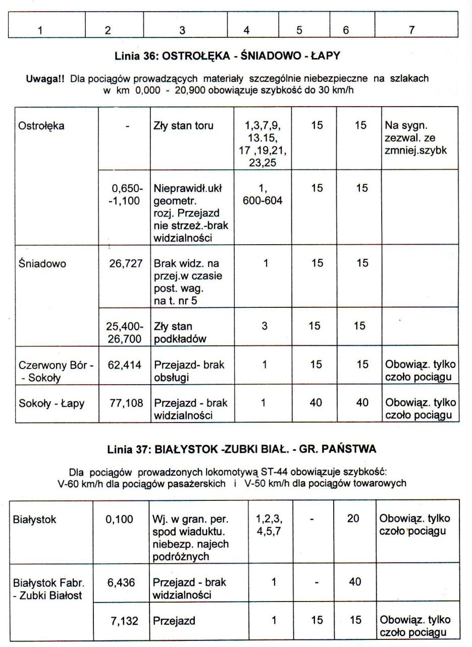 Tabela z Wykazu Ostrzeżeń Stałych na rok 2000 obowiązująca czasu, kiedy zawieszono przewozy na odcinku Śniadowo-Łapy. 62,414 to przejazd przez drogę powiatową nr 2052B przy p.o. Kulesze Kościelne, natomiast 77,108 to przejazd przez drogę wojewódzką nr 678 za stacją Sokoły.