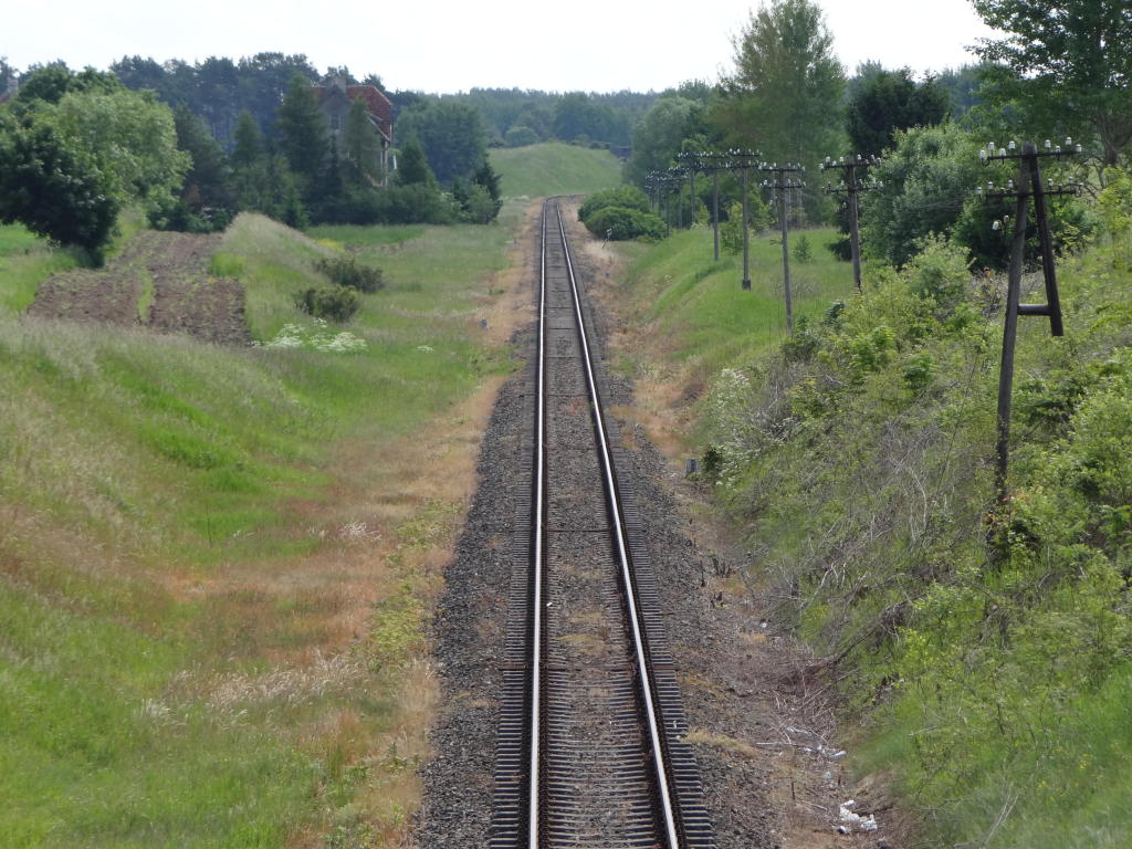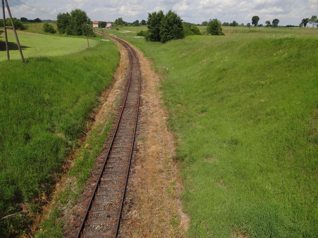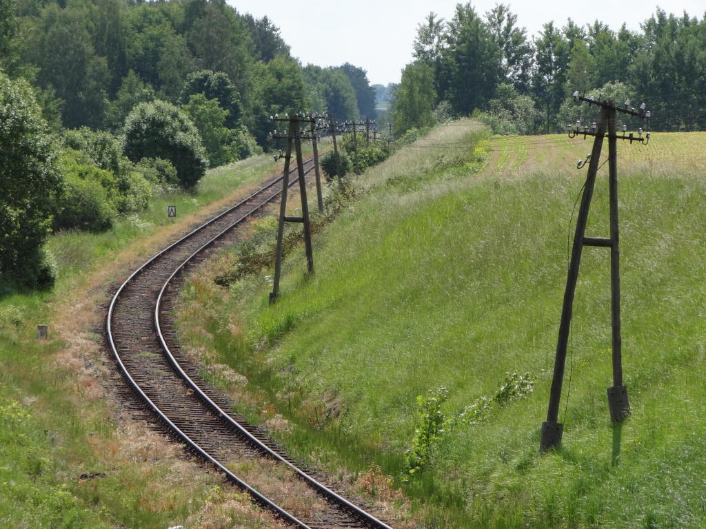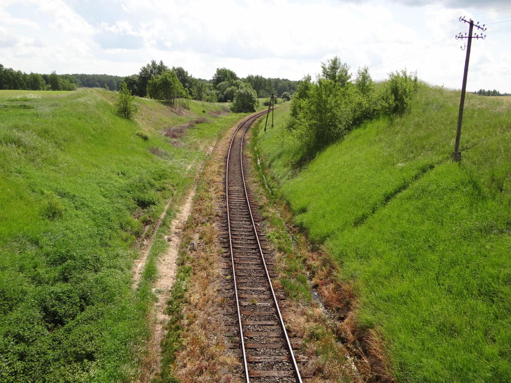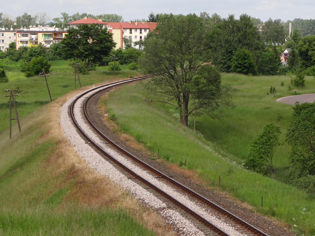 W oddali wiadukt drogowy w południowo-wschodnim Olecku. Widok w kierunku początku linii, Olecka. 3,0 km.