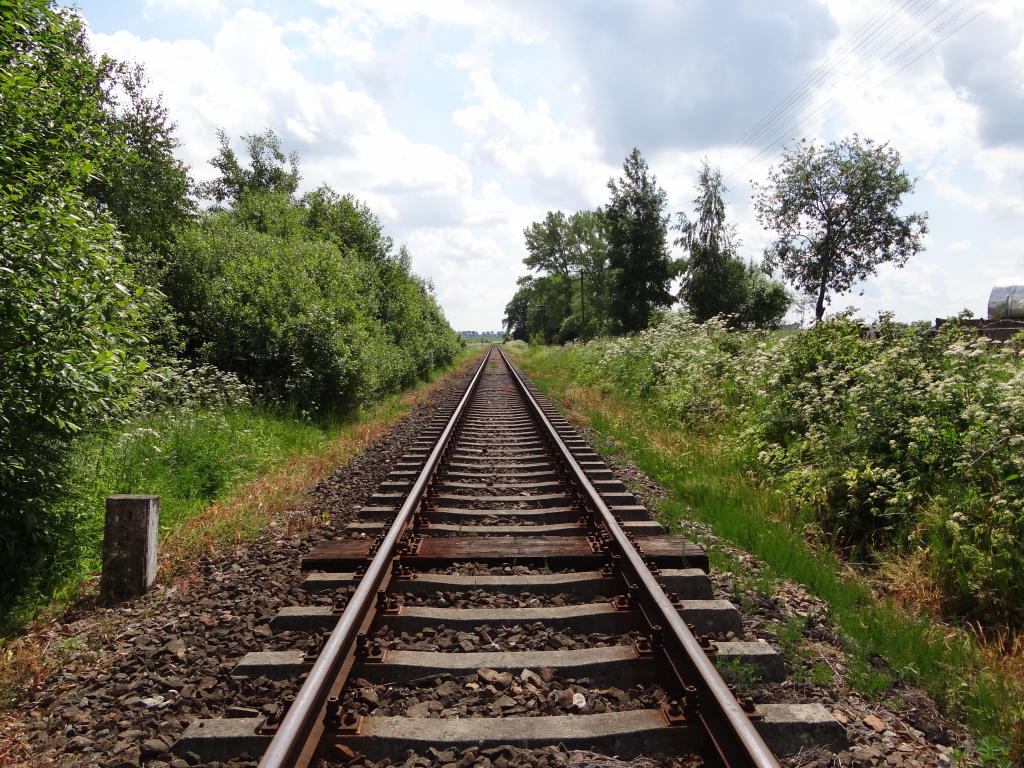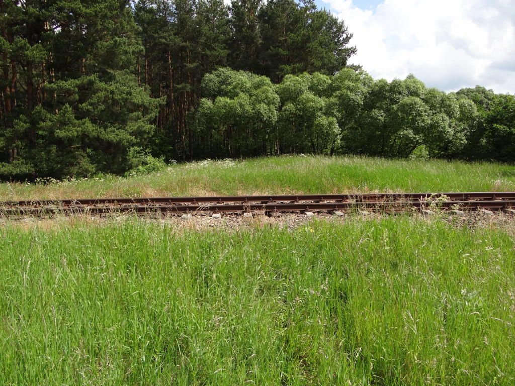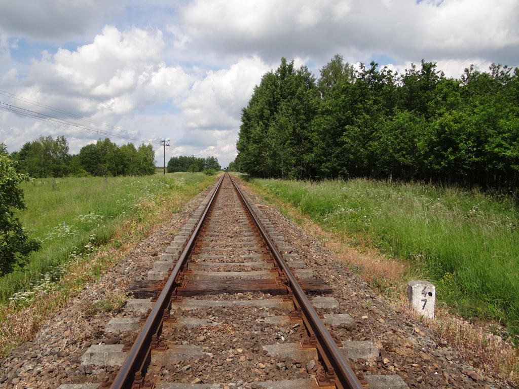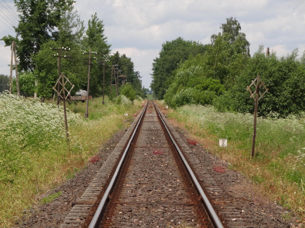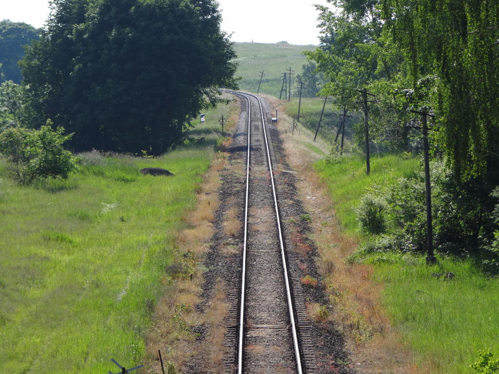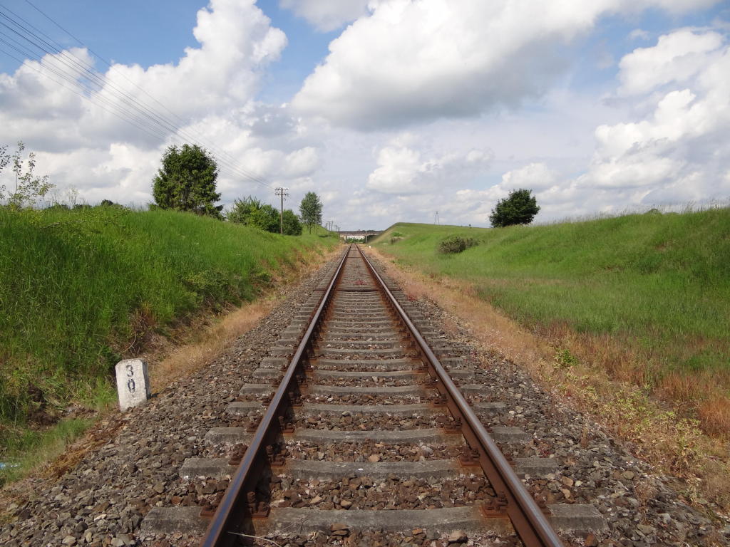 W oddali wiadukt drogowy w południowo-wschodnim Olecku. Widok w kierunku początku linii, Olecka. 3,0 km.