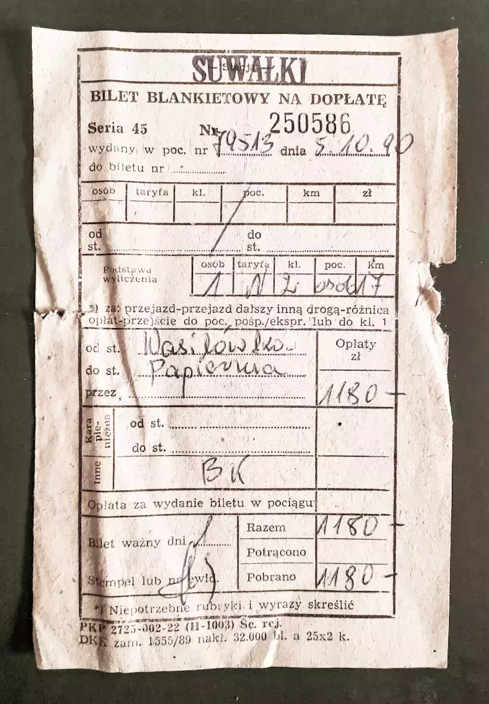 Zlikwidowany przejazd drogowy w Imionkach. W lewo Olecko, w prawo Suwałki. 4,4 km.