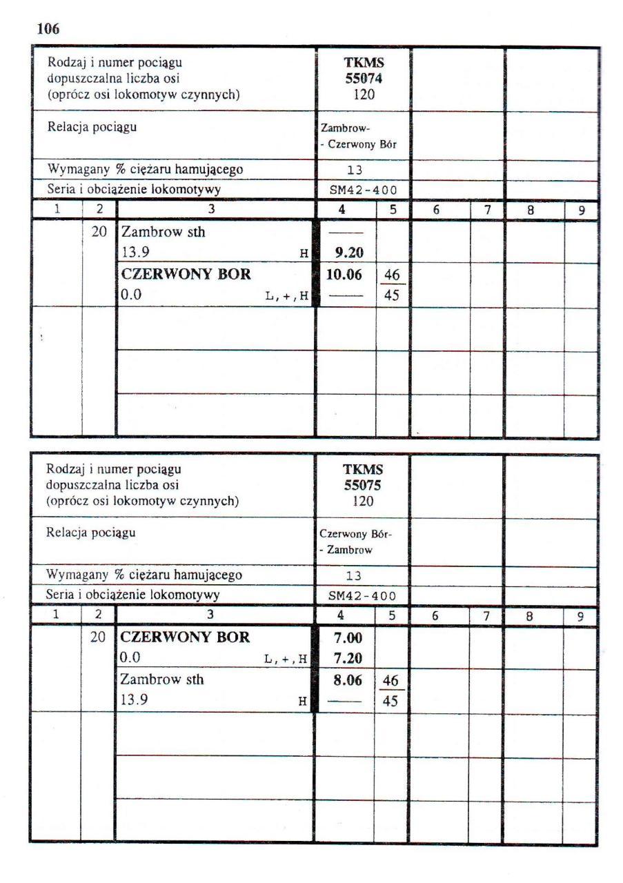 Przeglądając archiwalny rozkład jazdy to generalnie jakoś nie dziwi mnie, że ruch pasażerski zawieszono po trzech latach od uruchomienia, zwłaszcza, że pasażerowie byli skazani cały czas na przesiadki w Czerwonym Borze. Ale nie wiem czy była tego główna przyczyna, czy jeszcze coś innego doszło? W każdym razie do samego Zambrowa nie zanosi się aby miał wrócić tutaj ruch pasażerski. Tak jeszcze z tego co czytałem ponoć przez cały okres funkcjonowania ruch pasażerski obsługiwał tylko wyłącznie parowóz z kilkoma wagonami, ale nie udało mi się stwierdzić jaki to był konkretnie typ taboru. Umiałby ktoś zweryfikować te informacje? Czy wie ktoś jak wyglądały standardowe składy towarowe, które jeździły po tej linii u schyłku jej eksploatacji?