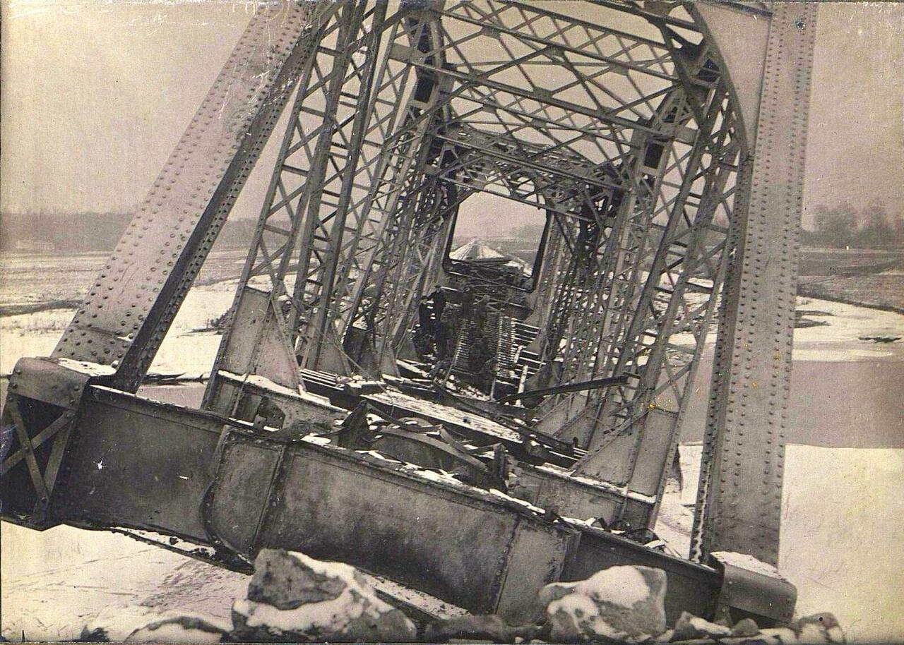 Zniszczony most na Pilicy przed odbudową przez 10. Batalion Kolejowy w listopadzie 1915 r.