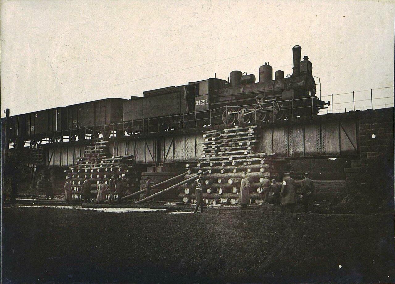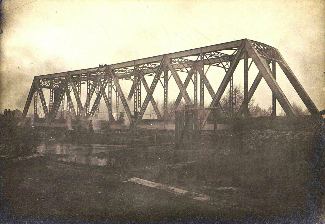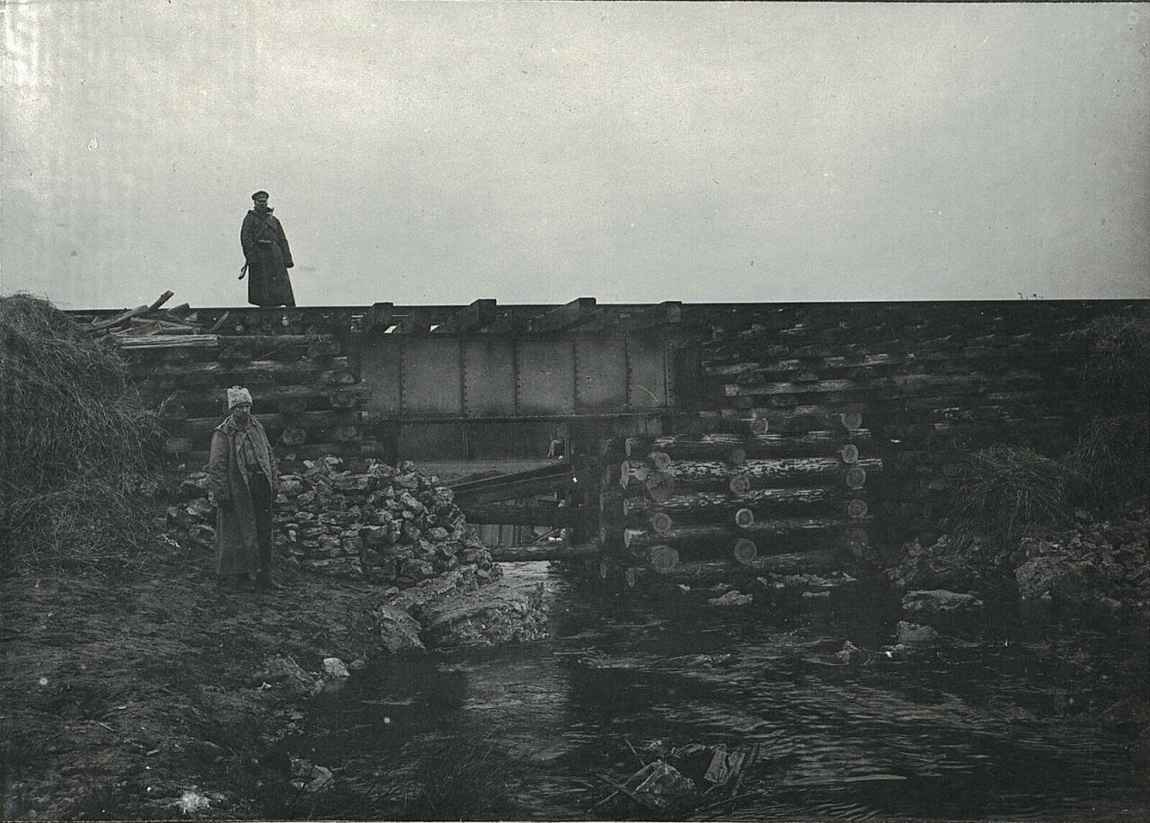 Prowizorycznie odbudowany w listopadzie 1915 r. most, przypuszczalnie w okolicy Żelisławic (67 wiorsta)