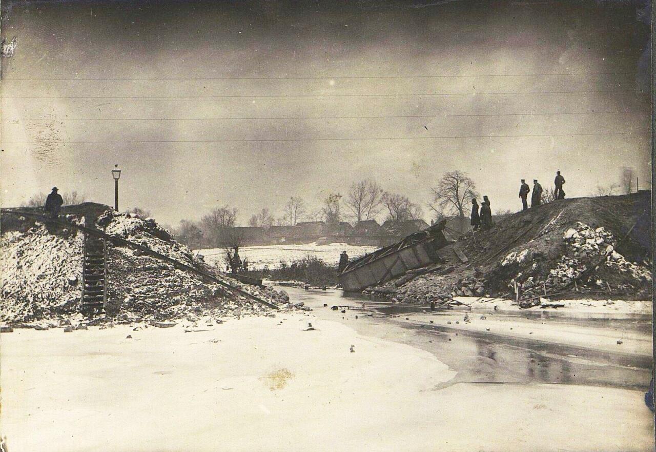 Zniszczony most na dopływie Pilicy, w pobliżu stacji Koniecpol, po odbudowie przez 10. Batalion Kolejowy w listopadzie 1915 r. - efekty powtórnego zniszczenia (podpalenie prowizorycznej konstrukcji drewnianej) przez ten sam batalion w grudniu 1915 r.