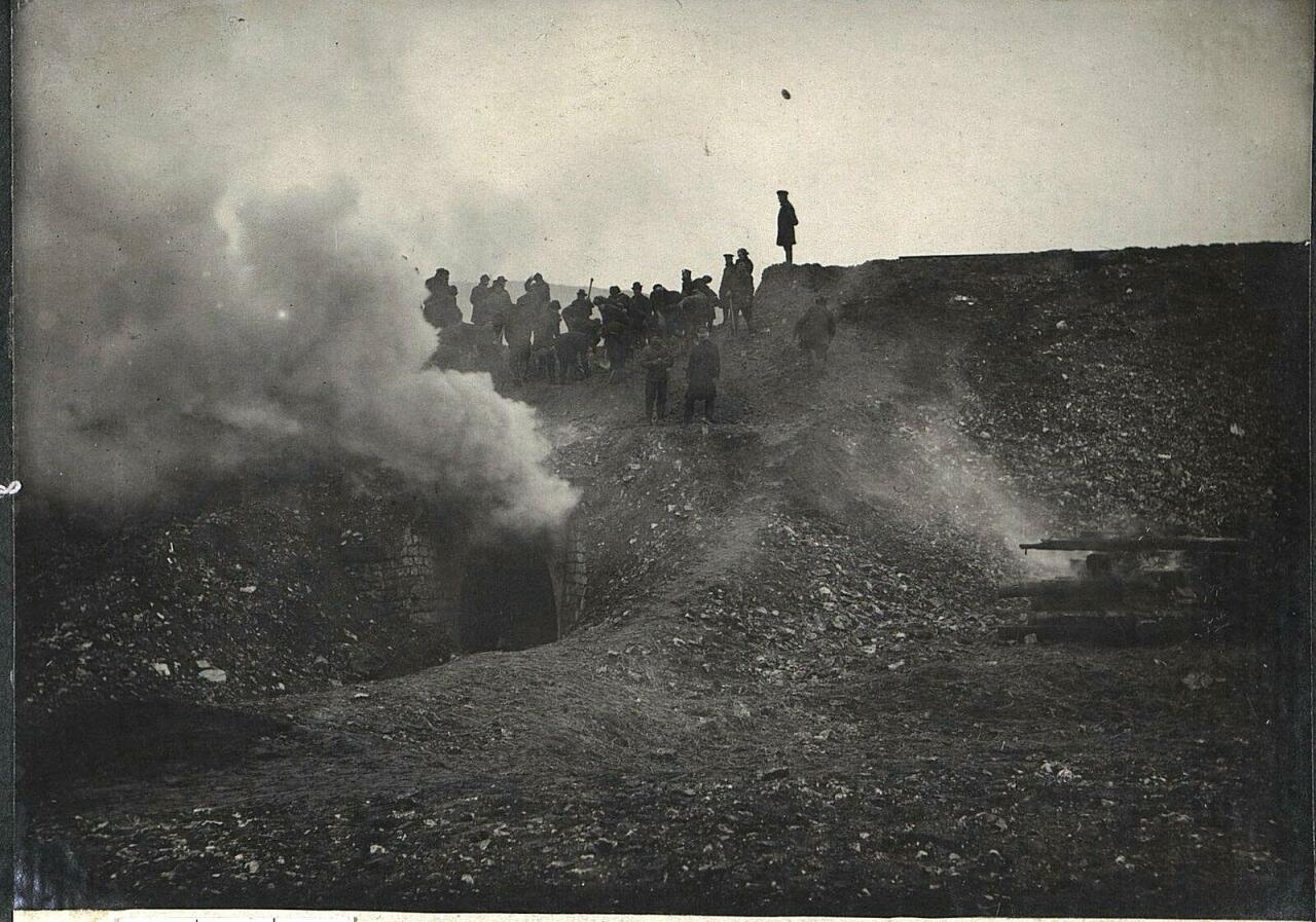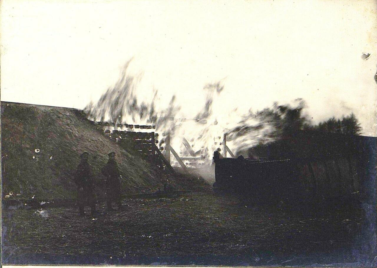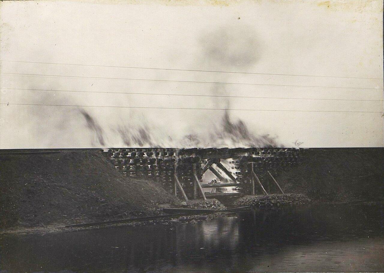 Zniszczony most na Pilicy po odbudowie przez 10. Batalion Kolejowy w listopadzie 1915 r. - w trakcie powtórnego niszczenia (podpalenie prowizorycznej drewnianej podpory) przez ten sam batalion w grudniu 1915 r.