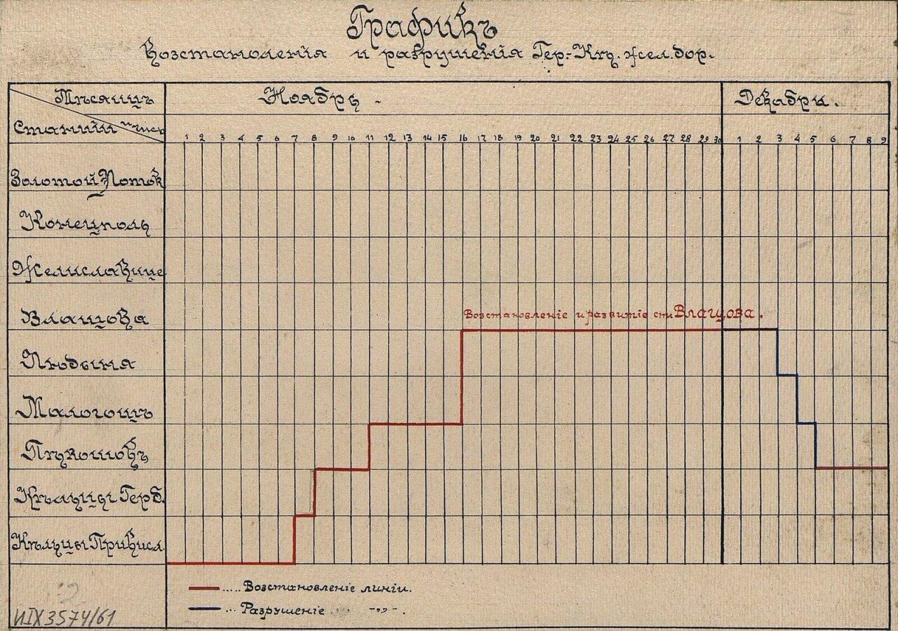 Schemat obrazujący działalność 10. Batalionu kolejowego na linii, na odcinku Kielce - Julianka (wówczas Złoty Potok) w listopadzie i grudniu 1915 r. Zasadniczo - w listopadzie linię odbudowywano po zniszczeniach wojennych (czerwona linia), a w grudniu - świeżo odbudowaną infrastrukturę niszczono w związku ze zmianą sytuacji militarnej. Ot, taki los infrastruktury kolejowej w czasach wojny…