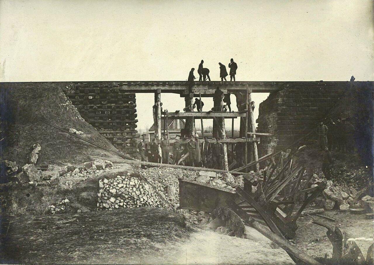 Zniszczony most na dopływie Pilicy w pobliżu stacji Koniecpol, po odbudowie przez 10. Batalion Kolejowy w listopadzie 1915 r. - w trakcie powtórnego niszczenia (podpalenie prowizorycznej konstrukcji drewnianej), przez ten sam batalion w grudniu 1915 r.