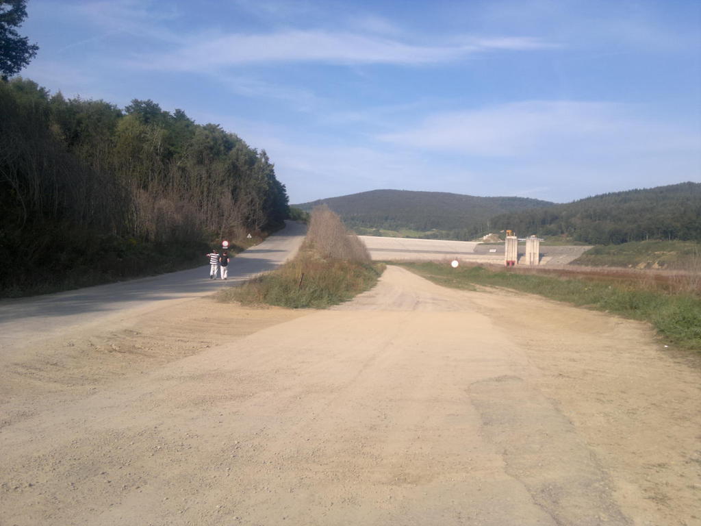 Zwiedzanie dna przyszłego zbiornika Świnna Poręba. W prawo odchodziła linia kolejowa w kierunku Wadowic (Czartaka), w górę szła droga w tym samym kierunku. W tle tama na zaporze. Porównałem stare mapy z naniesioną liną Trzebina - Skawce oraz dane z geoportalu. Cały teren przeznaczony jest do zalania.