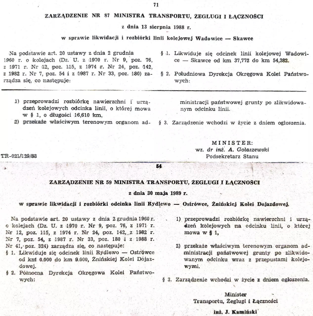 Zarządzenie Ministra Transportu, Żeglugi i Łączności dotyczące likwidacji i rozbiórki odcinka Wadowice - Skawce (pozycja 71), Zarządzenie Ministra Transportu, Żeglugi i Łączności dotyczące likwidacji i rozbiórki linii Rydlewo - Ostrówce (pozycja 54).