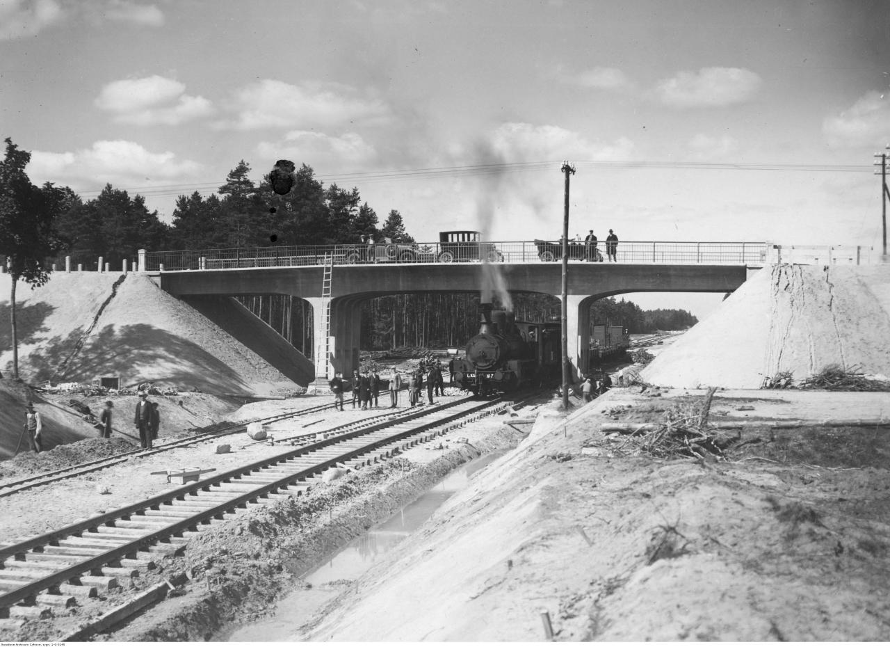 "Budowa magistrali kolejowej Śląsk - Gdynia na odcinku Herby - Kalety. Widoczny wiadukt szosy Częstochowa - Lubliniec nad linią kolejową. Na torach parowóz Tp 102 nr 7".