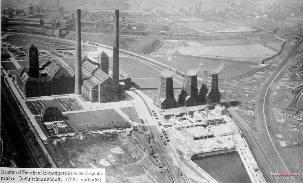 Foto lotnicza z pięknym widokiem na elektrownie. Po lewej szlak na Zabrze Biskupice. Pośrodku bocznica zakładu a po prawej linia na Tarnowskie Góry a na lewo od niej na prawo od chłodni kominowych - szlak Bytom – Ruda Orzegów.