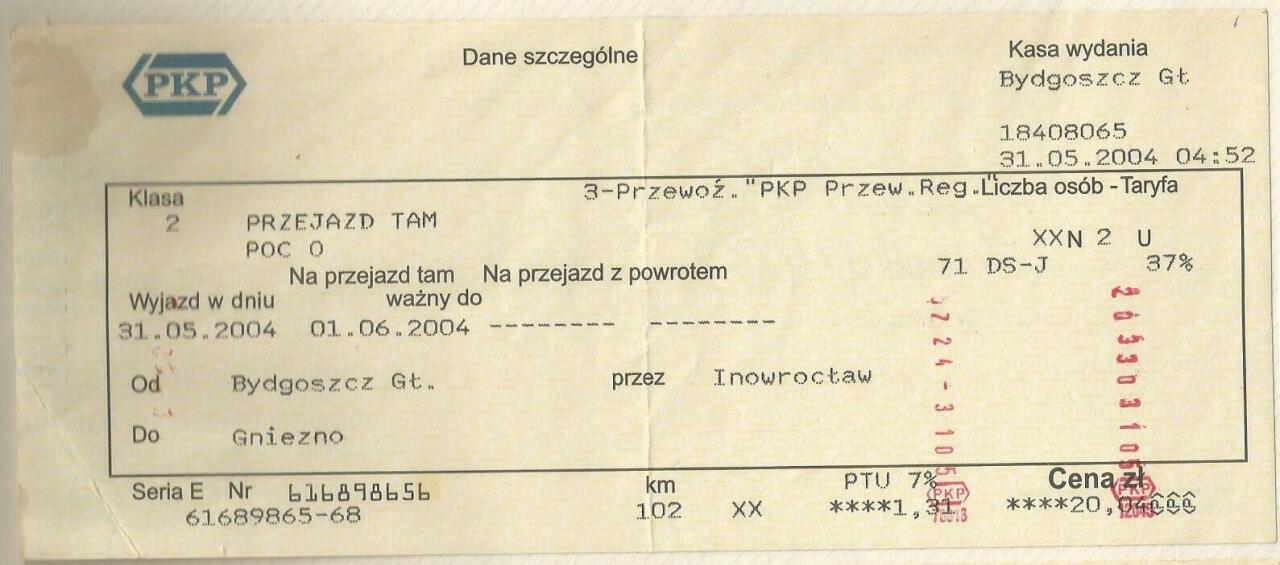 Bilet na przejazd z Bydgoszczy Głównej do Gniezna.
