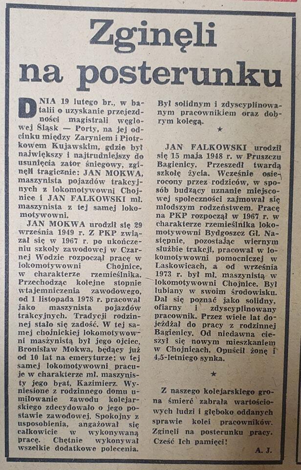 19 lutego 1979 roku, podczas akcji udrażniania Magistrali Węglowej doszło do tragicznego zdarzenia.