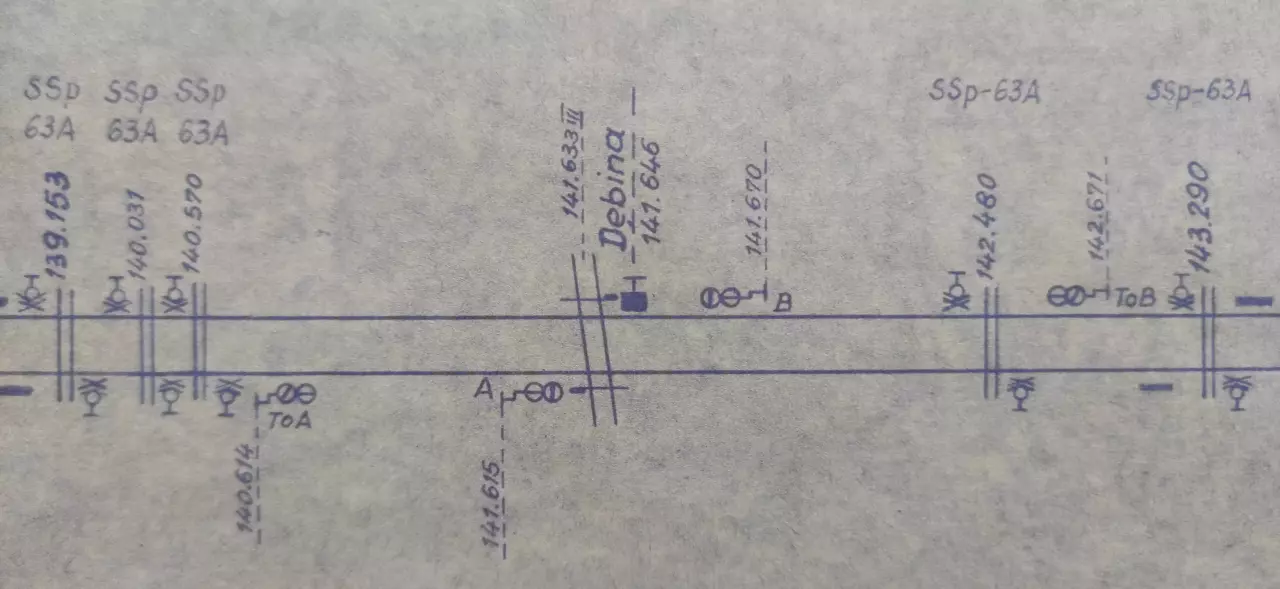 Posterunek odstępowy Dębina, położony w km 141,646 linii Katowice - Tczew (szlak Rusiec Łódzki - Chociw Łaski). Skan fragmentu szkicu sytuacyjnego linii Katowice - Tczew (odcinek Granica Północnej DOKP - Zduńska Wola Karsznice), wykreślony przez pracowników Zarządu Zabezpieczenia Ruchu i Łączności Północnej DOKP w Gdańsku. Stan na dzień 26 czerwca 1964 roku.