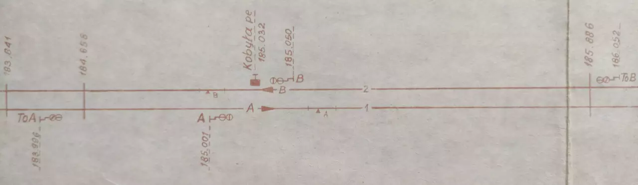 Posterunek odstępowy Kobyła, położony w km 185,032 linii Katowice - Tczew (szlak Szadek - Otok). Skan fragmentu szkicu sytuacyjnego odcinka Zduńska Wola Karsznice - Lipie Góry, wykreślony przez pracowników Zarządu Zabezpieczenia Ruchu i Łączności Północnej DOKP w Gdańsku. Stan na dzień 20 lutego 1965 roku.