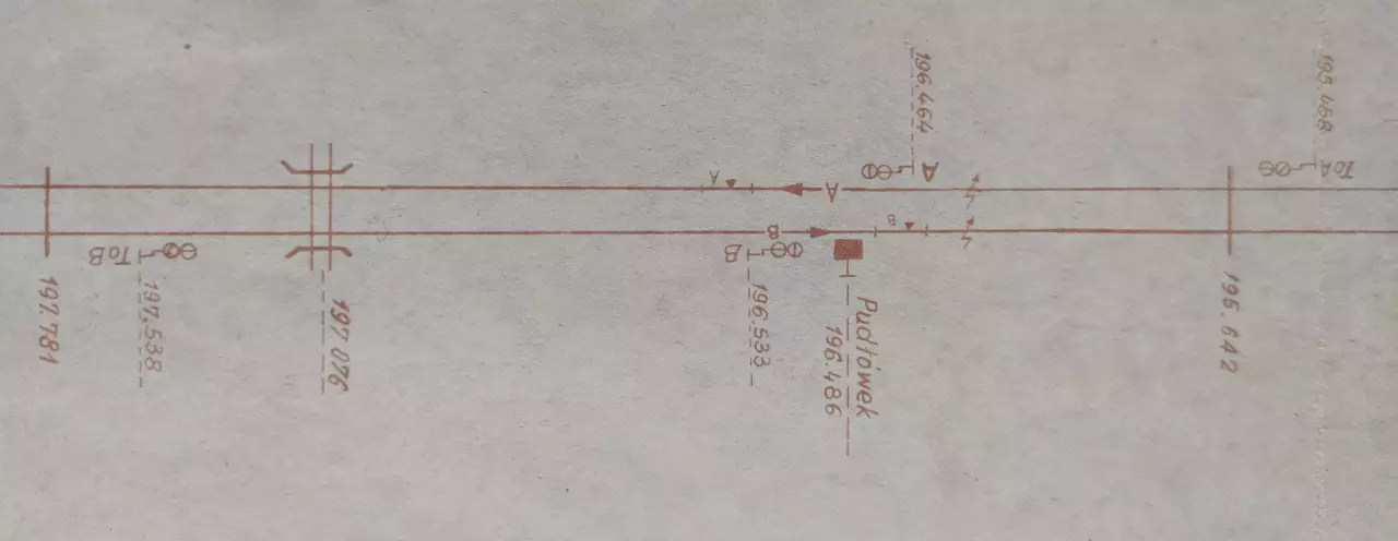 Posterunek odstępowy Pudłówek, położony w km 196,486 linii Katowice - Tczew (szlak Otok - Poddębice). Skan fragmentu szkicu sytuacyjnego odcinka Zduńska Wola Karsznice - Lipie Góry, wykreślony przez pracowników Zarządu Zabezpieczenia Ruchu i Łączności Północnej DOKP w Gdańsku. Stan na dzień 20 lutego 1965 roku.