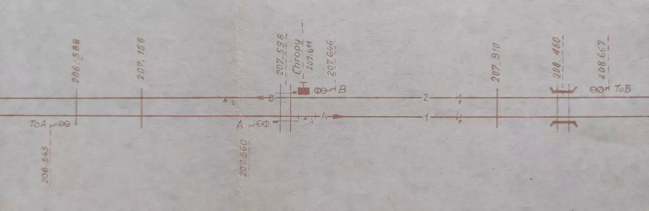 Posterunek odstępowy Chropy, położony w km 207,611 linii Katowice - Tczew (szlak Poddębice - Kłudna). Skan fragmentu szkicu sytuacyjnego odcinka Zduńska Wola Karsznice - Lipie Góry, wykreślony przez pracowników Zarządu Zabezpieczenia Ruchu i Łączności Północnej DOKP w Gdańsku. Stan na dzień 20 lutego 1965 roku.