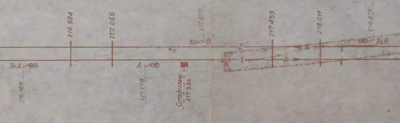 Posterunek odstępowy Grabiszew, położony w km 217,334 linii Katowice - Tczew (szlak Kłudna - Kraski). Skan fragmentu szkicu sytuacyjnego odcinka Zduńska Wola Karsznice - Lipie Góry, wykreślony przez pracowników Zarządu Zabezpieczenia Ruchu i Łączności Północnej DOKP w Gdańsku. Stan na dzień 20 lutego 1965 roku.