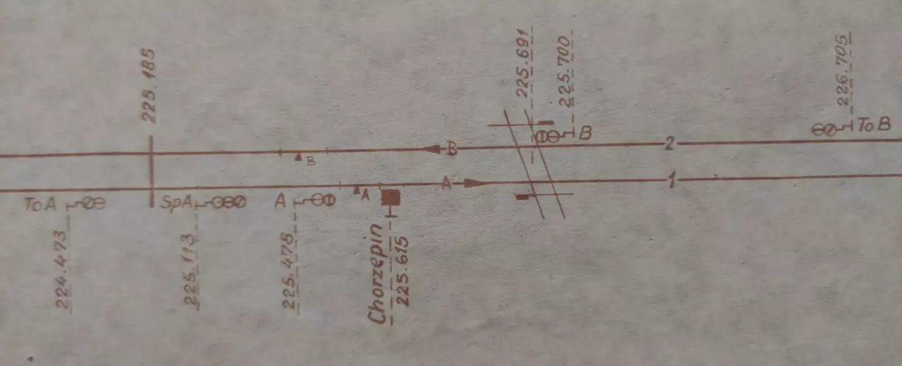 Posterunek odstępowy Chorzepin, położony w km 225,615 linii Katowice - Tczew (szlak Kraski - Dąbie nad Nerem). Skan fragmentu szkicu sytuacyjnego odcinka Zduńska Wola Karsznice - Lipie Góry, wykreślony przez pracowników Zarządu Zabezpieczenia Ruchu i Łączności Północnej DOKP w Gdańsku. Stan na dzień 20 lutego 1965 roku.